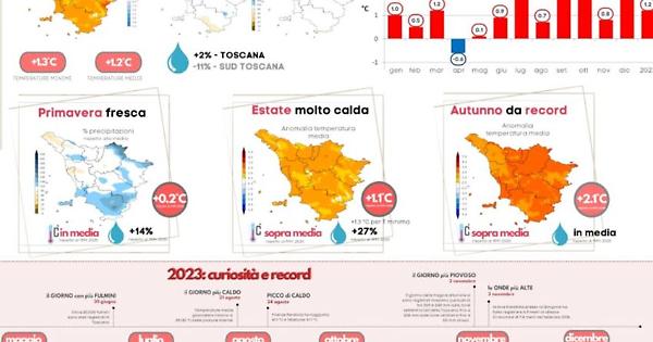;Caldo fuoristagione. Si fa fatica a definire ?inverno' il trimestre dicembre 2023-febbraio 2024. I dati osservati fino al 15 febbraio (1 dicembre 2023-15 febbraio 2024) lo classificano come l'inverno più caldo dal 1955, con una temperatura di oltre due gradi sopra la norma (+2.2 °C le temperature medie e +2.3 °C le massime). L'inverno più caldo, inoltre, segue l'autunno più caldo mai registrato in Toscana ed in Italia: rilevazioni preoccupanti in vista della primavera e dell'estate.I dati relativi al meteo nel 2023 e nei primi due mesi del 2024 sono stati illustrati dal presidente della Regione Toscana Eugenio Giani, dall'assessora regionale all'ambiente Monia Monni e dall'amministratore unico del Consorzio Lamma Bernardo Gozzini in occasione della presentazione del ?Rapporto Lamma 2023', analisi dell'andamento climatico in Toscana nel corso dell'anno appena trascorso.Presidente e assessora hanno fatto il punto sulla situazione attuale ed espresso la loro preoccupazione per il futuro, anche riguardo al tema siccità."Ringrazio il Lamma perché grazie il suo dettagliato lavoro di analisi è estremamente utile su più fronti, compreso quello della previsione e gestione delle criticità legate al meteo", ha detto Giani. "Ormai è incontrovertibile che il meteo sta cambiando e che la programmazione regionale, così come la sensibilità globale, deve tenerne conto. Tutti dobbiamo cercare di operare per contrastare, o almeno rallentare, il cambiamento climatico e al tempo stesso prepararci ad affrontarne le conseguenze. E questo chiarisce ancora di più perché sia essenziale intervenire per mettere in sicurezza il territorio e dotarlo di infrastrutture adeguate alle nuove sfide climatiche".La Toscana - ha ricordato Monni - sta elaborando il proprio Piano per la transizione ecologica. Un piano che poggia su due pilastri: da una parte la lotta ai cambiamenti climatici, dall'altra le politiche per aumentare la resilienza dei territori, la loro capacità di adattarsi e resistere ai nuovi fenomeni. Stiamo stimolando l'economia circolare, perché chiaramente cambiare i processi produttivi consente di risparmiare CO2, ma soprattutto stiamo facendo un Piano della transizione energetica molto radicale, che punta sul raddoppio dell'energia da fonti rinnovabili per diventare carbon neutral in netto anticipo sui tempi previsti dall'Europa. Su questo aspetto siamo fortunati perché in Toscana oltre al sole e al vento abbiamo la geotermia, ma serve anche un cambio di mentalità perché le fonti green vanno bene a tutti solo fino a quando i pannelli o le pale si mettono lontane dalla propria realtà. Naturalmente saremo i primi a tutelare il nostro paesaggio ed infatti stiamo discutendo con il Governo per avere più potere decisionale , dato che ad oggi su questo tema si ha un vuoto normativo ed in assenza di regole assistiamo a fenomeni di vera aggressione al territorio, spesso portate avanti da multinazionali, con distese di pannelli che realmente entrano in conflitto sia con il paesaggio che con l'agricoltura".Ecco il 2023 secondo i dati Lamma, riportati durante la conferenzaSecondo i dati Lamma i mesi dicembre 2023 e gennaio 2024 hanno fatto registrare temperature spesso miti, chiudendosi con quasi due gradi sopra la media (+1.9 °C rispetto al 1991-2020), e lo stesso trend sembra riproporsi a febbraio.L'andamento climatico è stato eccezionalmente mite, con pochissima neve sulle montagne. Se nel periodo dal 15 febbraio a fine mese si confermerà l'andamento attuale, questo sarà confermato come l'inverno più caldo per la Toscana.Nel complesso il 2023 a livello globale è risultato l'anno più caldo mai registrato, mentre in Toscana è il ?secondo' più caldo (subito dopo il 2022, che ha registrato solo +0.1 °C) con una temperatura media superiore di +1.2 °C rispetto al periodo 1991-2020, e di +2.1 °C rispetto al trentennio 1961-1990.Nel corso del 2023 ben 11 mesi su 12 hanno registrato temperature sopra media, con l'unica eccezione di aprile (-0.6 °C).Ben 7 mesi hanno registrato valori mensili di oltre un grado sopra la norma. Tra questi spicca il record di ottobre con +3.5 °sopra media.E' stata la sesta estate più calda dal 1955 (+1.1 °C sopra media) con le minime che si sono rivelate particolarmente elevate (+1.3 °C); le notti tropicali, cioè quelle con temperature sopra i 20 °C, sono state il 60% in più rispetto al normale (25 rispetto a 15). Due lunghe ondate di caldo hanno caratterizzato il bimestre luglio ? agosto (ad eccezione di una breve parentesi fresca i primi giorni di agosto). Sul finire del bimestre sono stati superati anche i record storici delle massime a Pistoia (40.9 °C) e Prato (40.8 °C).Ancora più eccezionale il trimestre autunnale, con una temperatura di 2.1 °C sopra la media: è risultato essere il più caldo di sempre in Toscana ed in Italia.Settembre è stato praticamente un mese estivo e ad ottobre ben 26 giorni su 31 hanno registrato valori molto sopra la media. Nei primi giorni di ottobre sono stati abbattuti anche i record di temperatura massima più alta in quasi tutti i capoluoghi di provincia toscani, a partire dai 33.2 °C di Firenze (1° ottobre) ai 30.2 °C di Pisa (2 ottobre).Dal punto di vista delle piogge la situazione è di più complessa lettura, perché sebbene la quantità totale di pioggia caduta nel 2023 sia pressoché in media, la distribuzione temporale delle precipitazioni è stata veramente discontinua. Il 30-40% delle precipitazioni di tutto il 2023 si è infatti concentrato tra il 18 ottobre e il 10 novembre, complice l'evento alluvionale del 2 novembre nelle province di Prato e Pistoia."A fronte di un pianeta che si scalda a ritmi sempre più rapidi è fondamentale comprendere che gli effetti di questi cambiamenti possono essere anche molto diversi da una zona all'altra - ha spiegato l'amministratore unico del Lamma Gozzini - Per questo le analisi regionali sono essenziali e ci consentono di comprendere meglio come nella nostra reg