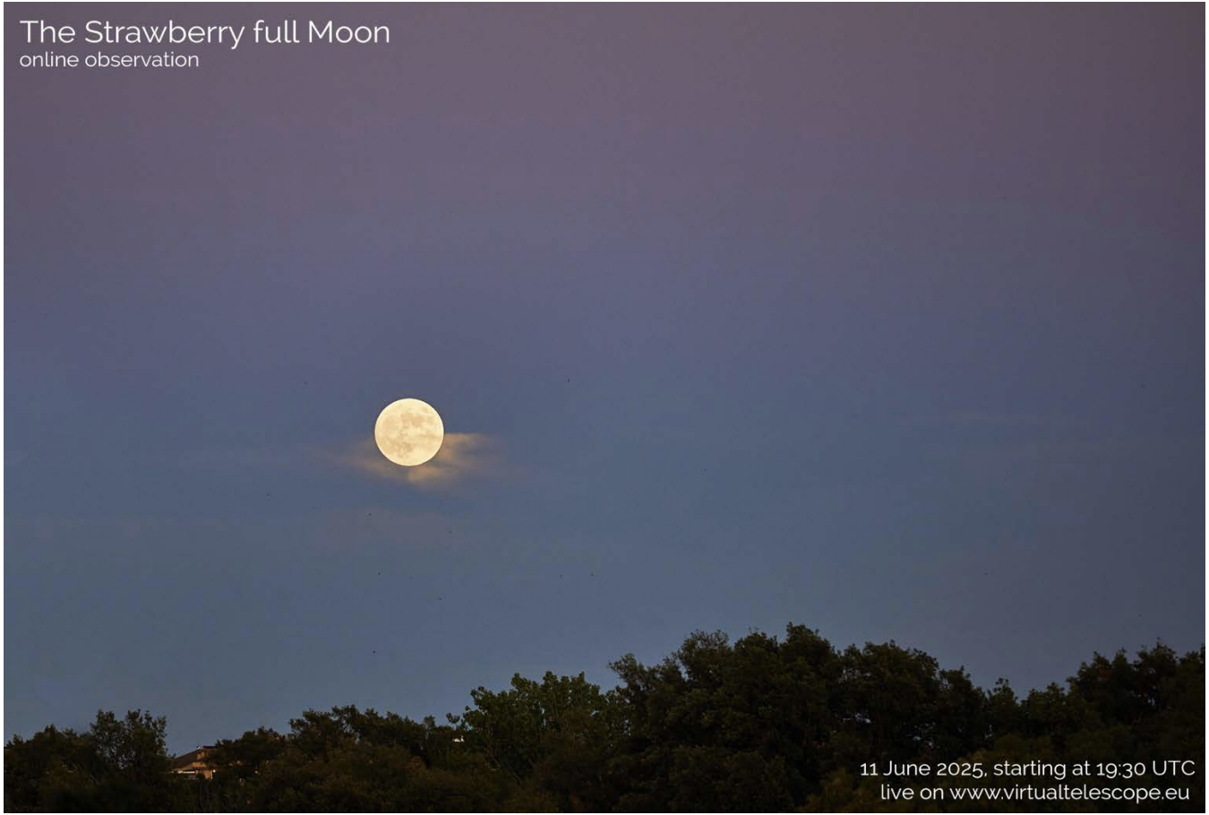 Il Virtual Telescope Project, grazie ai suoi strumenti installati a Manciano, riprenderà la Luna Piena delle Fragole, come è chiamata nella tradizione americana per via del concomitante raccolto dei piccoli frutti, mentre sorge sull’orizzonte della Maremma, condividendo in diretta la visione in tutto il mondo. Il commento all’evento sarà dello stesso astrofisico Gianluca Masi.