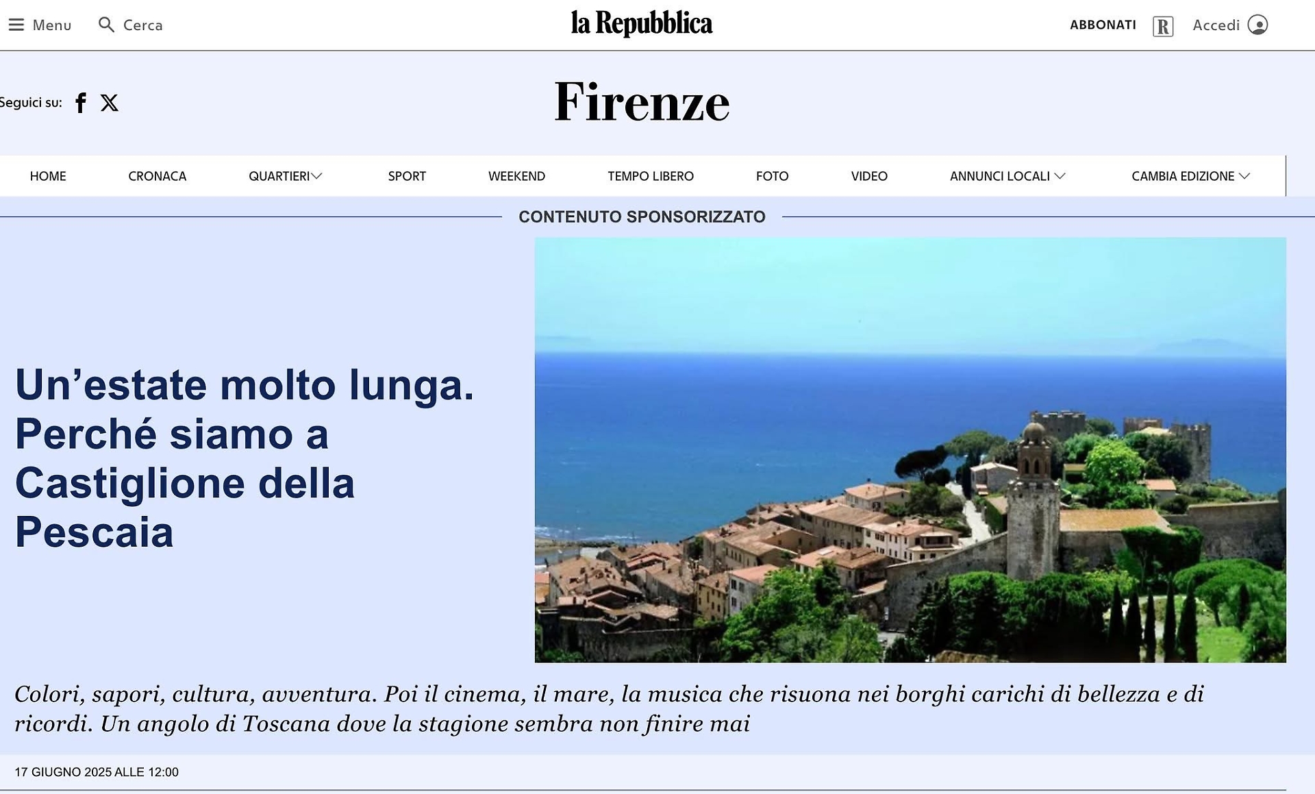 «Una vetrina importante», si legge nel post ufficiale, «scelta all'interno della campagna promozionale 2025 del Comune di Castiglione della Pescaia, per raccontare un'estate tutta da vivere tra mare, eventi e cultura». L'articolo sarà in homepage su Repubblica.it per due settimane, offrendo una straordinaria occasione di visibilità al territorio e alle sue iniziative.