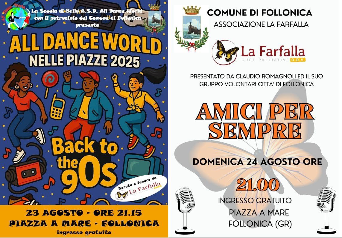 Piazza Guerrazzi a Follonica si prepara ad accogliere due serate all’insegna della solidarietà e dello spettacolo, con un doppio appuntamento a favore dell’associazione “La Farfalla – Cure Palliative ODV”. L’ingresso sarà gratuito per entrambe le manifestazioni, che si terranno sabato 23 e domenica 24 agosto.