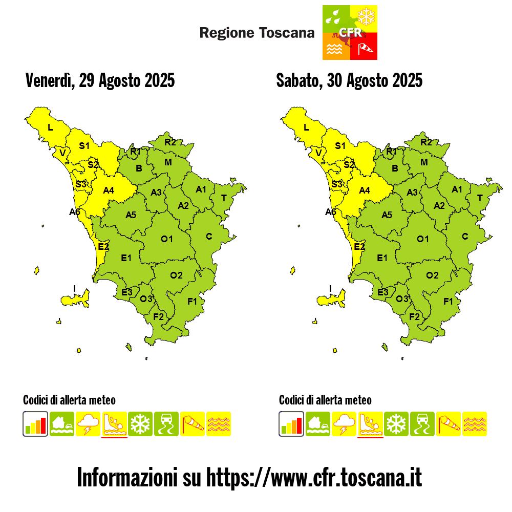 Migliorano le condizioni meteo, ma permane instabilità. La Sala operativa regionale della protezione civile ha emesso un codice giallo per rischio idrogeologico-idraulico del reticolo minore e temporali forti, valido dalle 22 di questa sera, venerdì 29 agosto, fino alle 13 di domani, sabato 30 agosto, limitatamente alle zone di nord-ovest e isole. Un altro codice giallo per vento e mareggiate, dalle 15 di oggi fino alle 13 di domani, riguarda invece la costa centro-settentrionale e le isole.