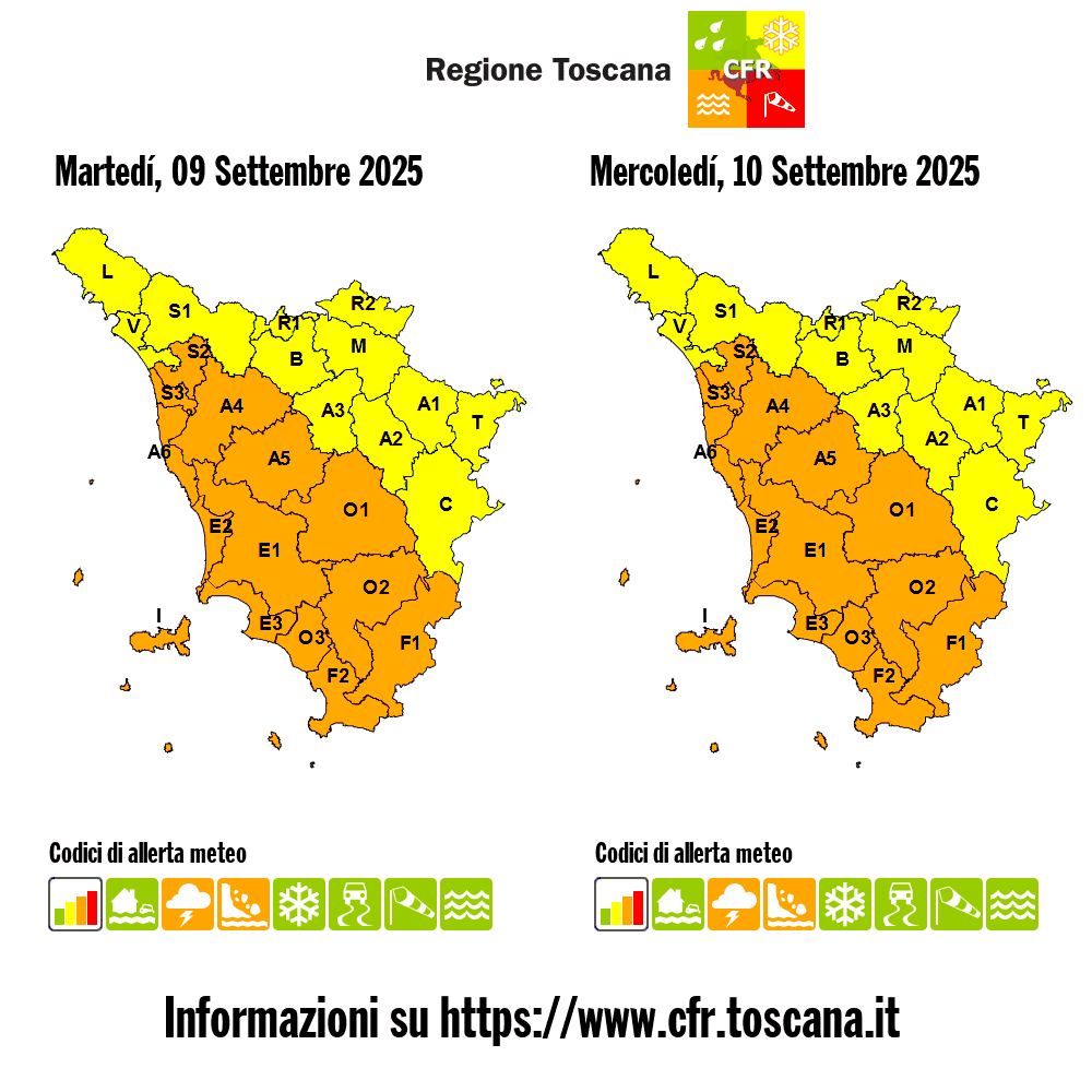 Il tempo è destinato a peggiorare nelle prossime ore e dall'allerta gialla si passa all'allerta arancione. È la previsione emessa dalla Sala operativa della Regione Toscana, per rischio idrogeologico e temporali forti dalle ore 17 di oggi – martedì 9 settembre – fino alle ore 13 di domani, mercoledì 10 settembre sulla Toscana centrale e l'arcipelago.