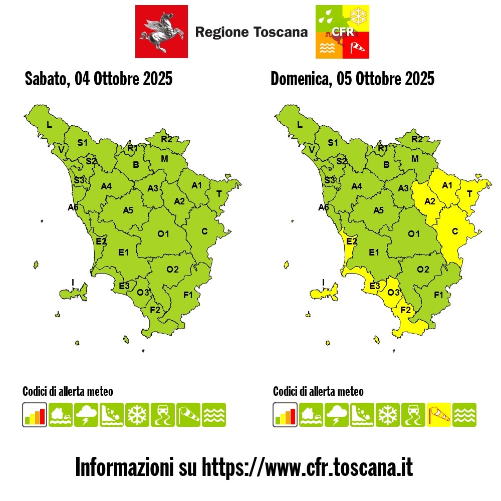 L’allerta sarà in vigore dalle 6 alle 15 del 5 ottobre. Coinvolgerà le province di Arezzo, Firenze, Grosseto, Livorno, Siena. Nel dettaglio le aree interessate sono Valtiberina, Valdichiana, Casentino e Valdarno superiore a est, e, oltre alle isole, la costa etrusca e grossetana a sud.