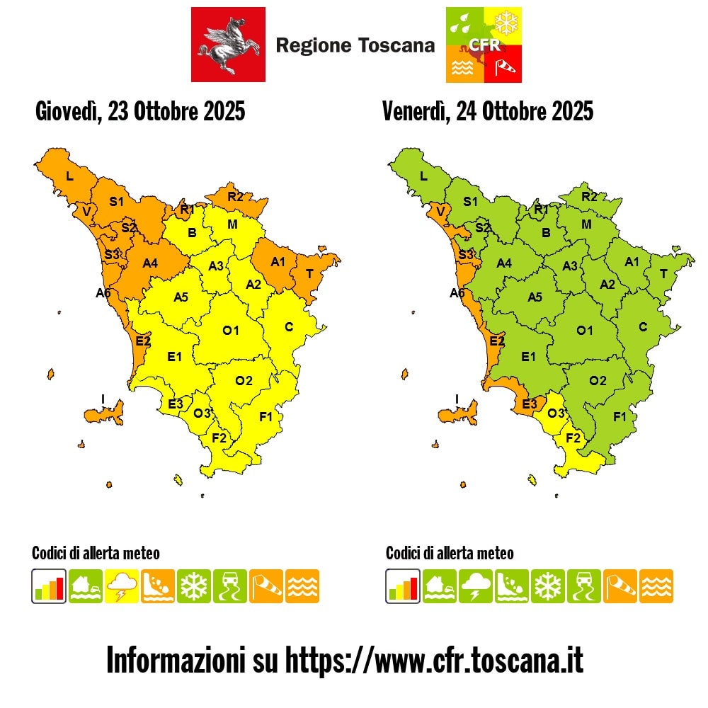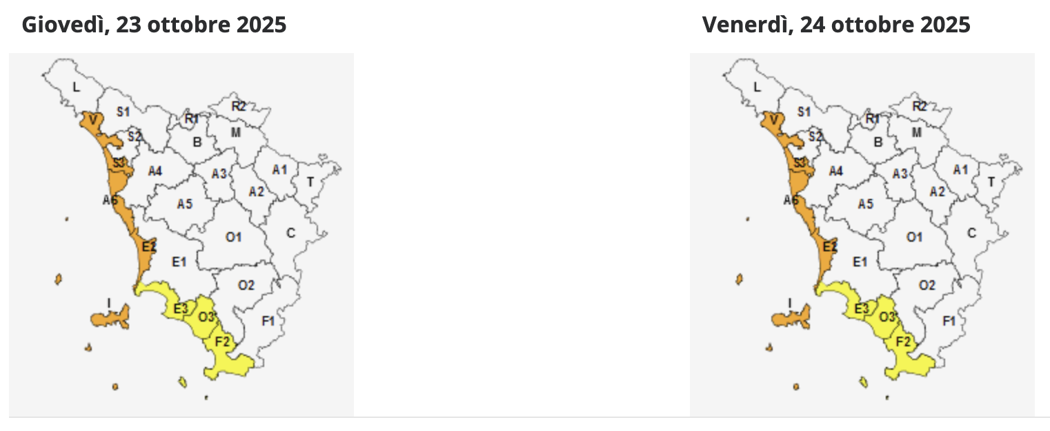 Prorogato anche l’avviso di criticità per mareggiate. Sulla costa centro-nord, arcipelago compreso, l’allerta permane di codice arancione dalle 15 di oggi, giovedì 23 ottobre, fino alle 6 di domani, venerdì 24, mentre la criticità prevista fino alla mezzanotte di domani è di codice giallo. Esteso fino alle 6 di venerdì anche il codice giallo per mareggiate sulla costa della Maremma, valido dalle 20 di oggi.