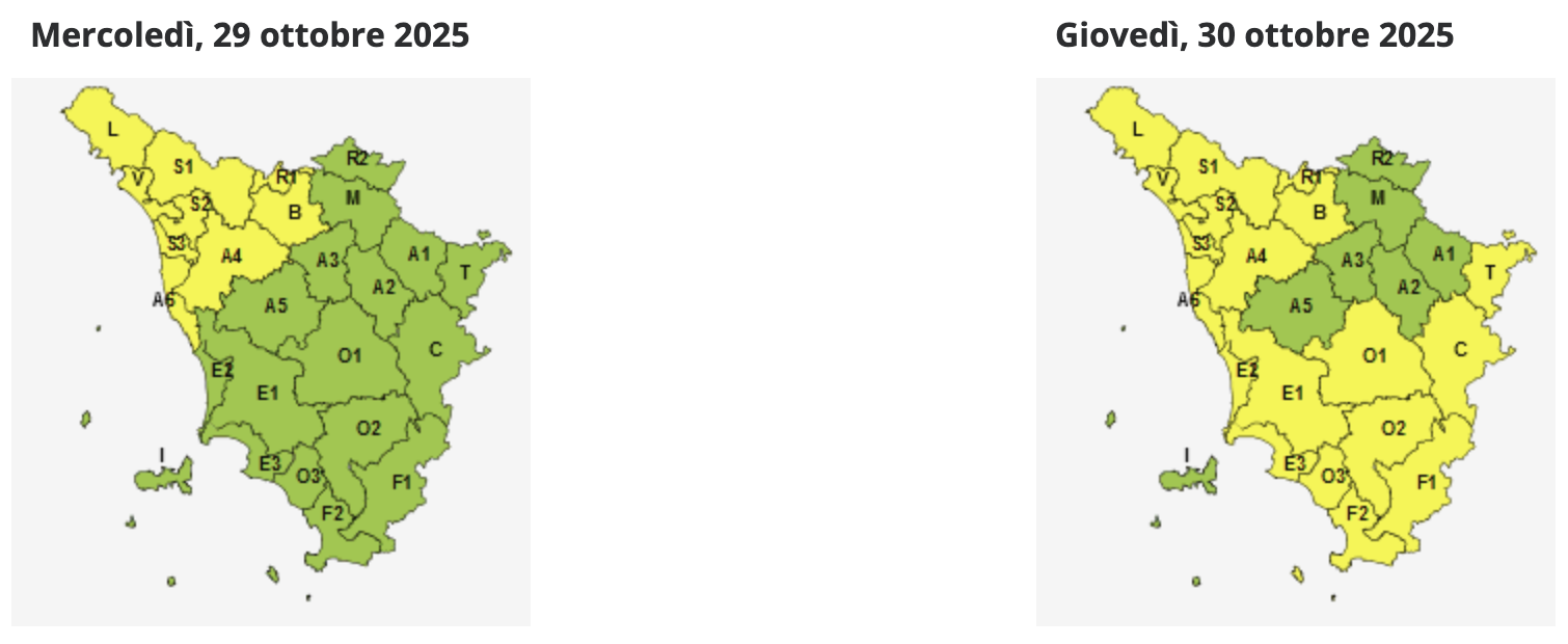 Per questo, la Sala operativa unificata della protezione civile regionale ha emesso un’allerta con codice giallo per temporali forti e rischio idrogeologico idraulico del reticolo minore, valido dalle 18 di oggi, mercoledì 29, per le zone di nord ovest, e dalle ore 12 fino alle 22 di domani, giovedì 30, per le altre zone interessate. Ha inoltre emesso un codice giallo per rischio idraulico del reticolo principale per la Lunigiana e i bacini del Bisenzio e Ombrone Pistoiese dalle 10 alle 23 di giovedì.