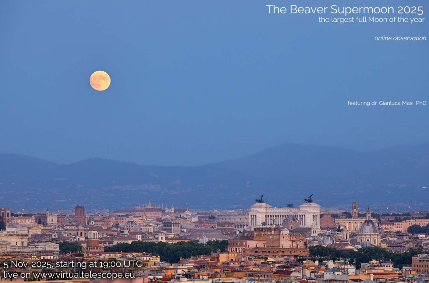 Il Virtual Telescope Project riprenderà e mostrerà in diretta la “Superluna del Castoro”, la luna Piena più grande dell’anno, con i suoi strumenti installati a Manciano, sotto il cielo più puro da inquinamento luminoso dell’Italia peninsulare. Verranno mostrate, inoltre, alcune straordinarie immagini di repertorio che immortalano il satellite su alcuni dei più celebri monumenti di Roma.