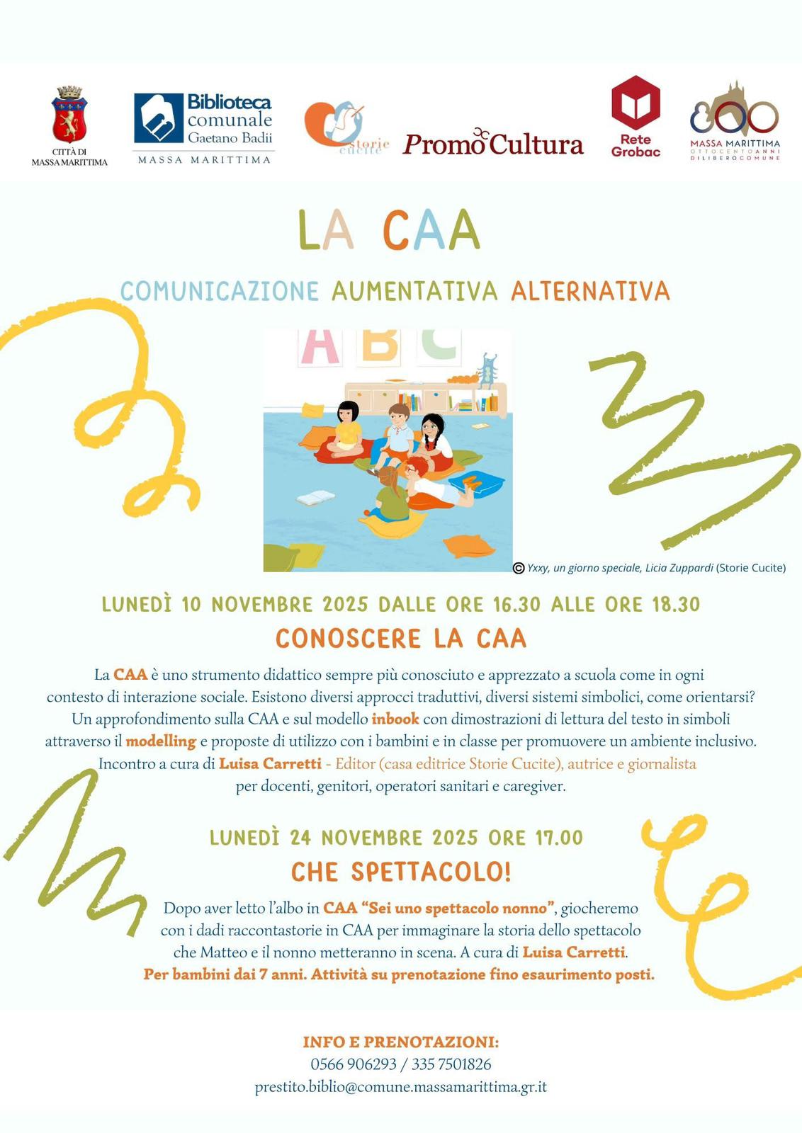 Lunedì 10 novembre, dalle 16:30 alle 18:30, la biblioteca comunale di Massa Marittima ospiterà il corso “Conoscere la CAA (Comunicazione Aumentativa Alternativa)”, a cura di Luisa Carretti, editor per Storie Cucite, autrice e giornalista.