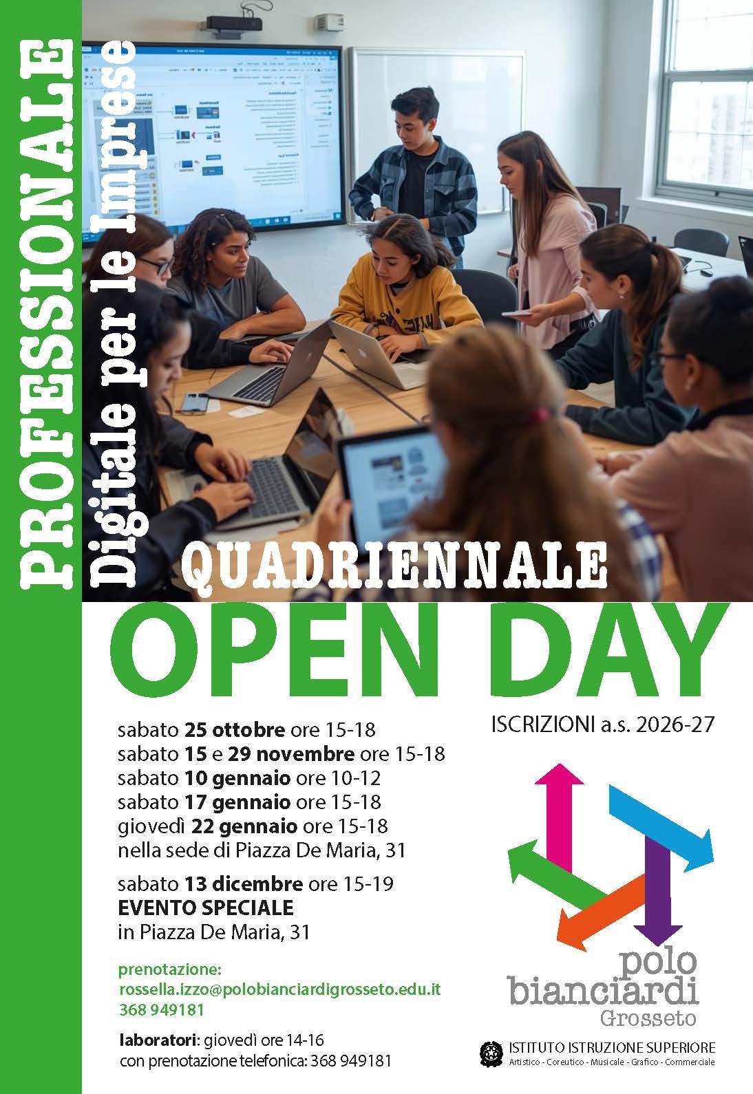Per l’anno scolastico 2026/2027 il Polo Bianciardi presenta un nuovo percorso quadriennale “Digitale per le Imprese”, inserito nella nuova filiera tecnico-professionale e pensato in raccordo con Istruzione Tecnica Superiore (ITS) e mondo del lavoro.
