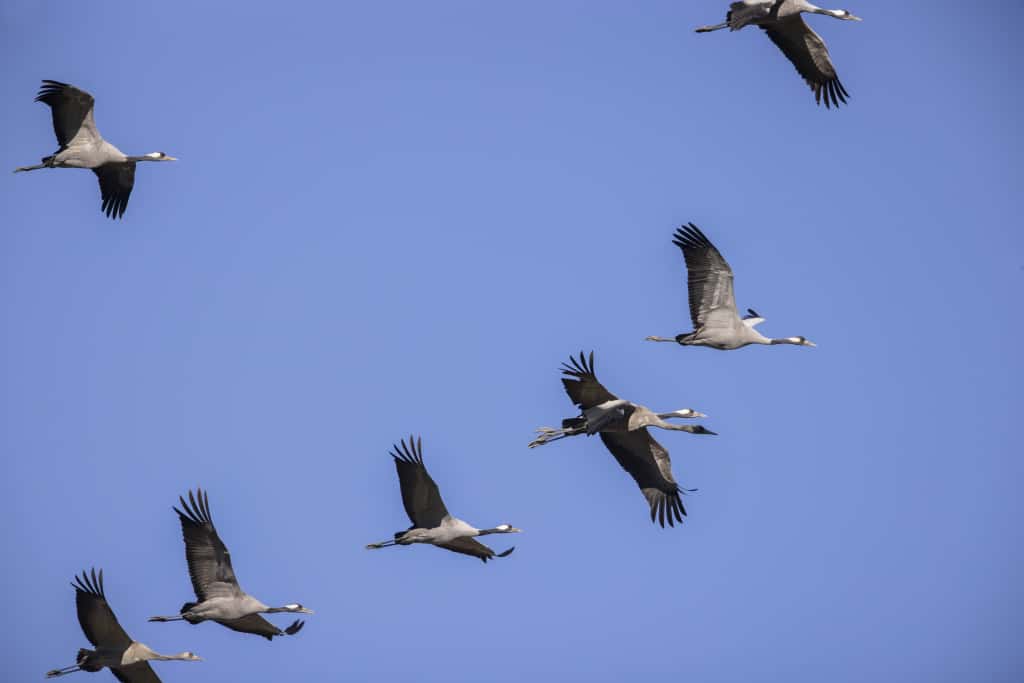 Durante la notte, il migliaio di esemplari che soggiorna in Maremma si raduna nel padule della Trappola. Di giorno, invece, è possibile osservare gruppi più piccoli nei campi coltivati, alla ricerca di cibo. “Le gru si nutrono principalmente di granaglie e semi, e non è difficile avvistarle, ad esempio, nelle risaie della zona di Principina. Poi, all’imbrunire o nelle prime ore notturne, fanno ritorno verso la Trappola, il loro ricovero notturno”, aggiunge Pezzo.