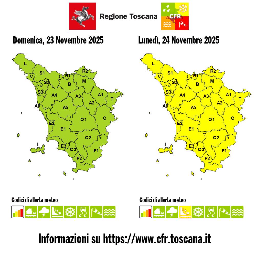 Piogge e temporali in arrivo su tutta la Toscana. Dalla serata di oggi, ma soprattutto nella giornata di domani lunedì 24 novembre una nuova perturbazione interesserà la Toscana con piogge anche molto abbondanti in arrivo specie sul versante nord ovest. La Sala operativa della Regione Toscana ha emesso il nuovo bollettino meteo che prevede allerta gialla per rischio idrogeologico su tutta la Toscana nella giornata di domani, lunedì 24 novembre.