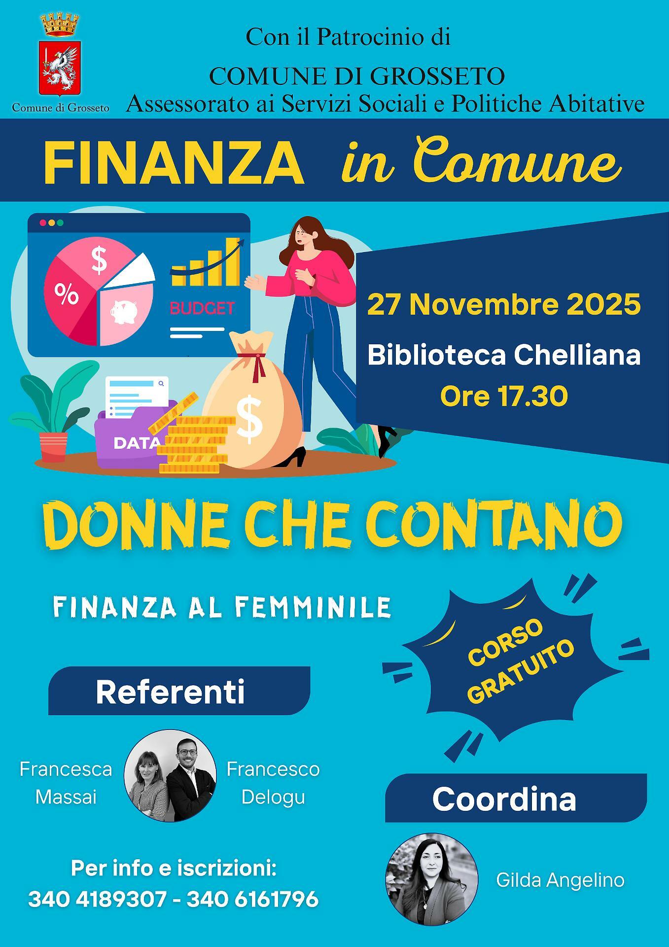 Mercoledì 27 novembre 2025, alle ore 17.30, la Biblioteca Chelliana di Grosseto ospiterà l’iniziativa gratuita “Donne che contano: finanza al femminile”, promossa con il patrocinio del Comune di Grosseto, assessorato ai Servizi sociali e politiche abitative.
