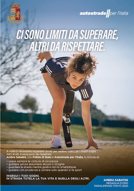 Ambra Sabatini è il volto scelto da Polizia di Stato e Autostrade per l’Italia per una campagna nazionale sulla sicurezza stradale che si propone di raccontare in modo diretto e credibile quanto ogni gesto alla guida possa fare la differenza tra sicurezza e tragedia. La campionessa paralimpica toscana – maremmana di Porto Ercole – è un simbolo di resilienza dopo il grave incidente stradale che le è costato una gamba, è oggi protagonista delle nuove campagne di sensibilizzazione dedicate alla sicurezza sulle nostre autostrade.