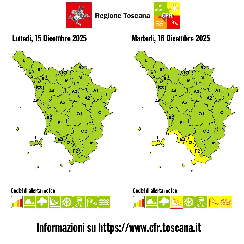 Per la giornata di domani, martedì 16 dicembre, infatti, è stata emessa una allerta gialla per rischio idrogeologico, mareggiate e vento forte sulla costa meridionale e l'arcipelago con piogge in graduale estensione nella mattinata e in particolare dal pomeriggio a tutto il territorio regionale. Le piogge risulteranno al più di moderata intensità o a carattere di rovescio su tutta la fascia costiera e l'arcipelago, dove risulteranno più abbondanti e insistenti, mentre risulteranno generalmente deboli o al più moderate sulle zone più interne della regione. Raffiche di vento fino a 70-90 km/h nell'arcipelago.