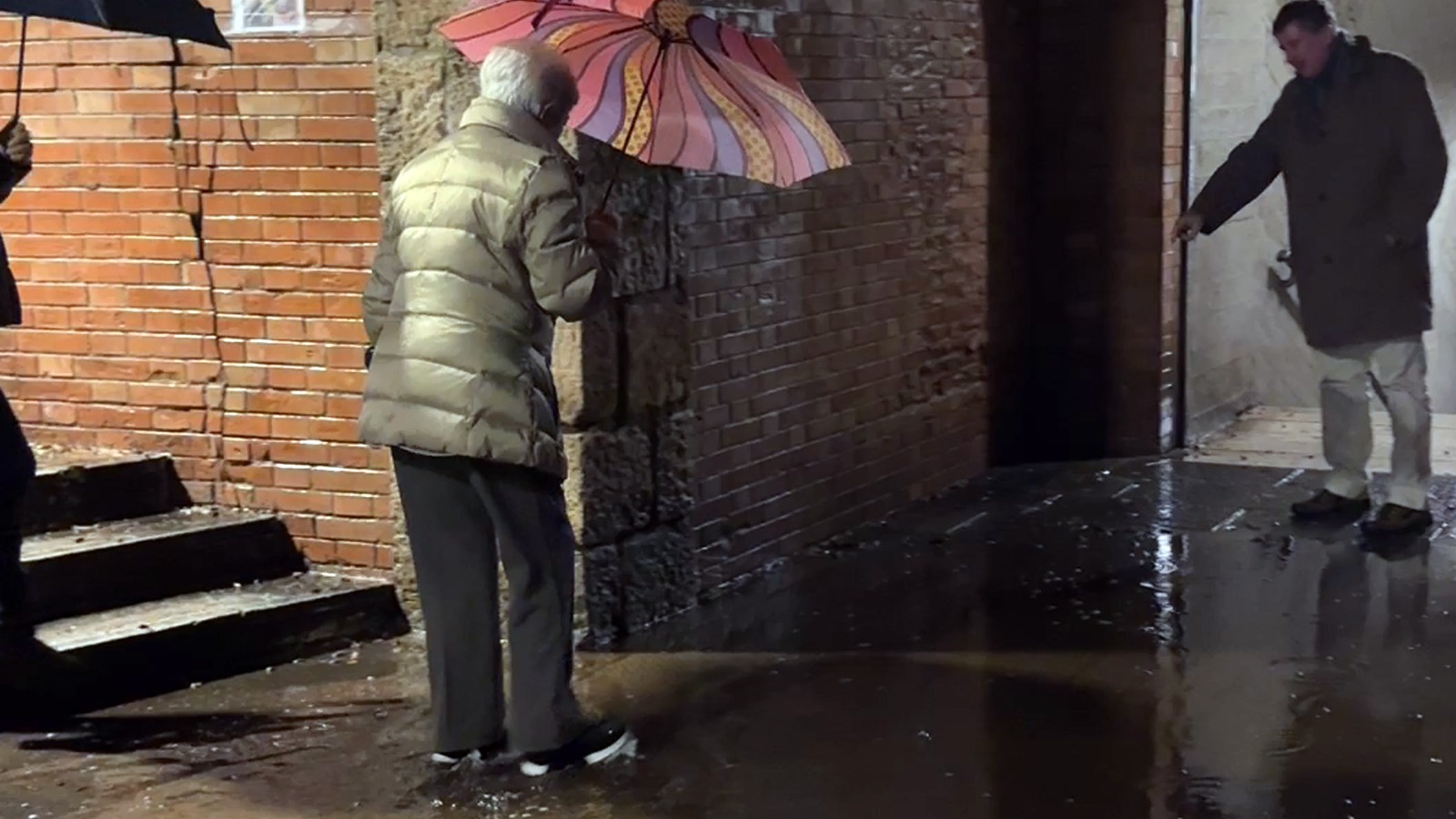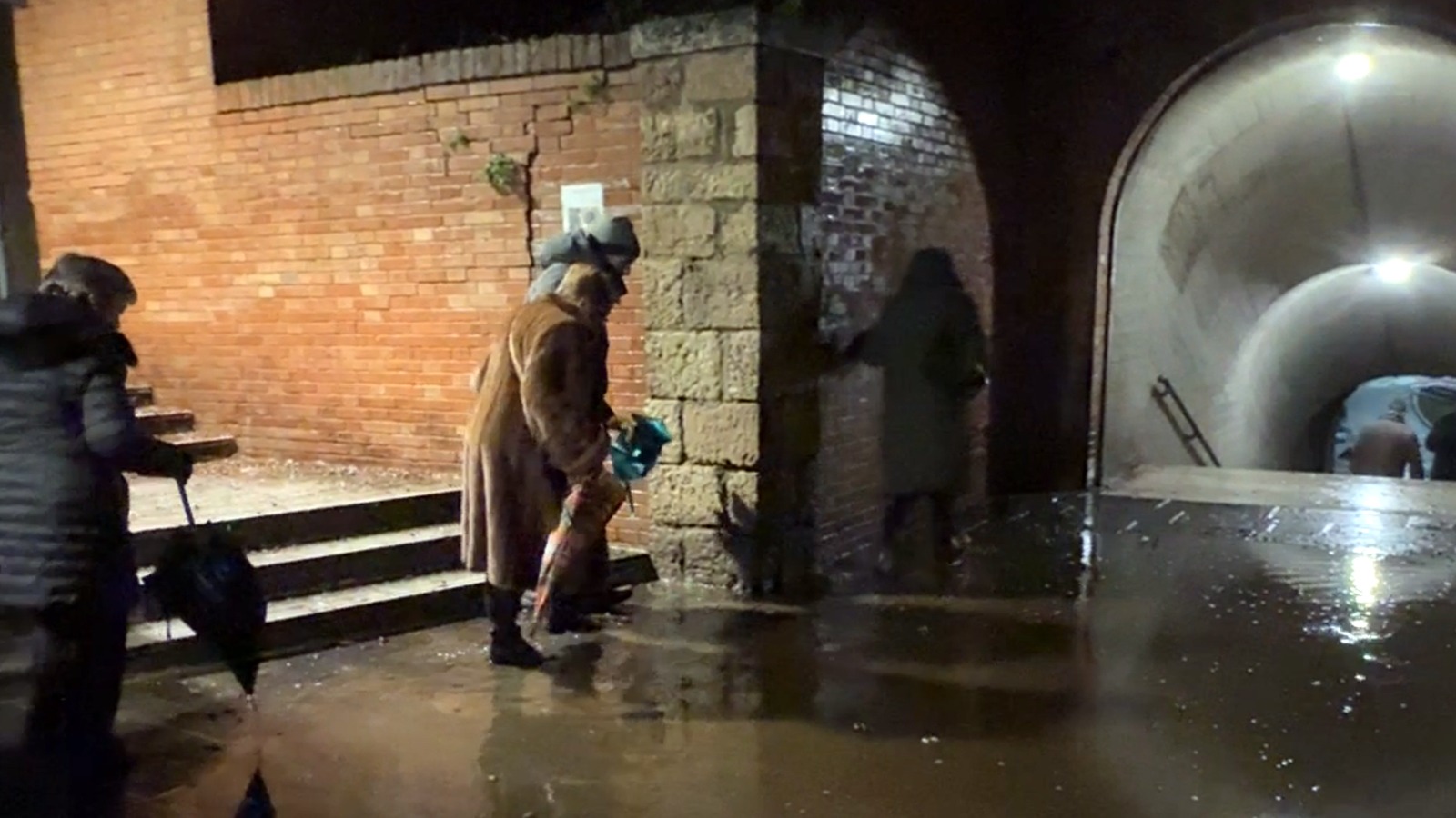 Chi deve attraversare è costretto a procedere con cautela, camminando nell’acqua che copre la pavimentazione. In alcuni punti il livello appare tale da rendere necessario l’uso di stivali o calzature impermeabili, mentre il riflesso delle luci sull’acqua accentua la sensazione di disagio e precarietà.