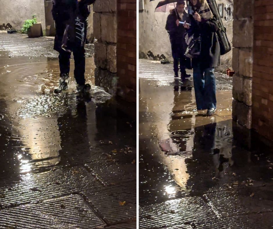 Le persone che hanno scelto di passare per non trovarsi a fare tutto il giro di quella parte di Mura Medicce, hanno cercato di avanzare lentamente, cercando di mantenere l’equilibrio e di evitare le zone più profonde, mentre l’acqua ristagna lungo tutto il passaggio, occupando lo spazio che normalmente consente un transito agevole.