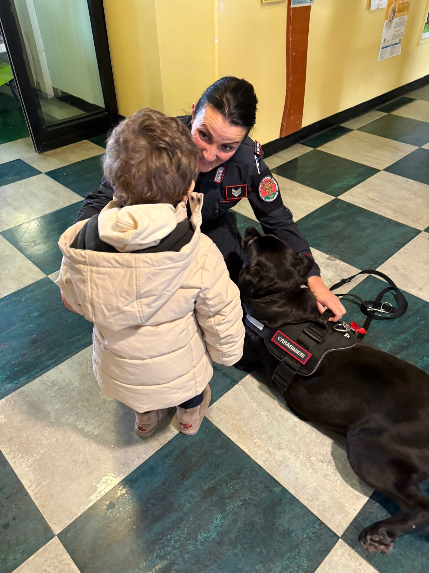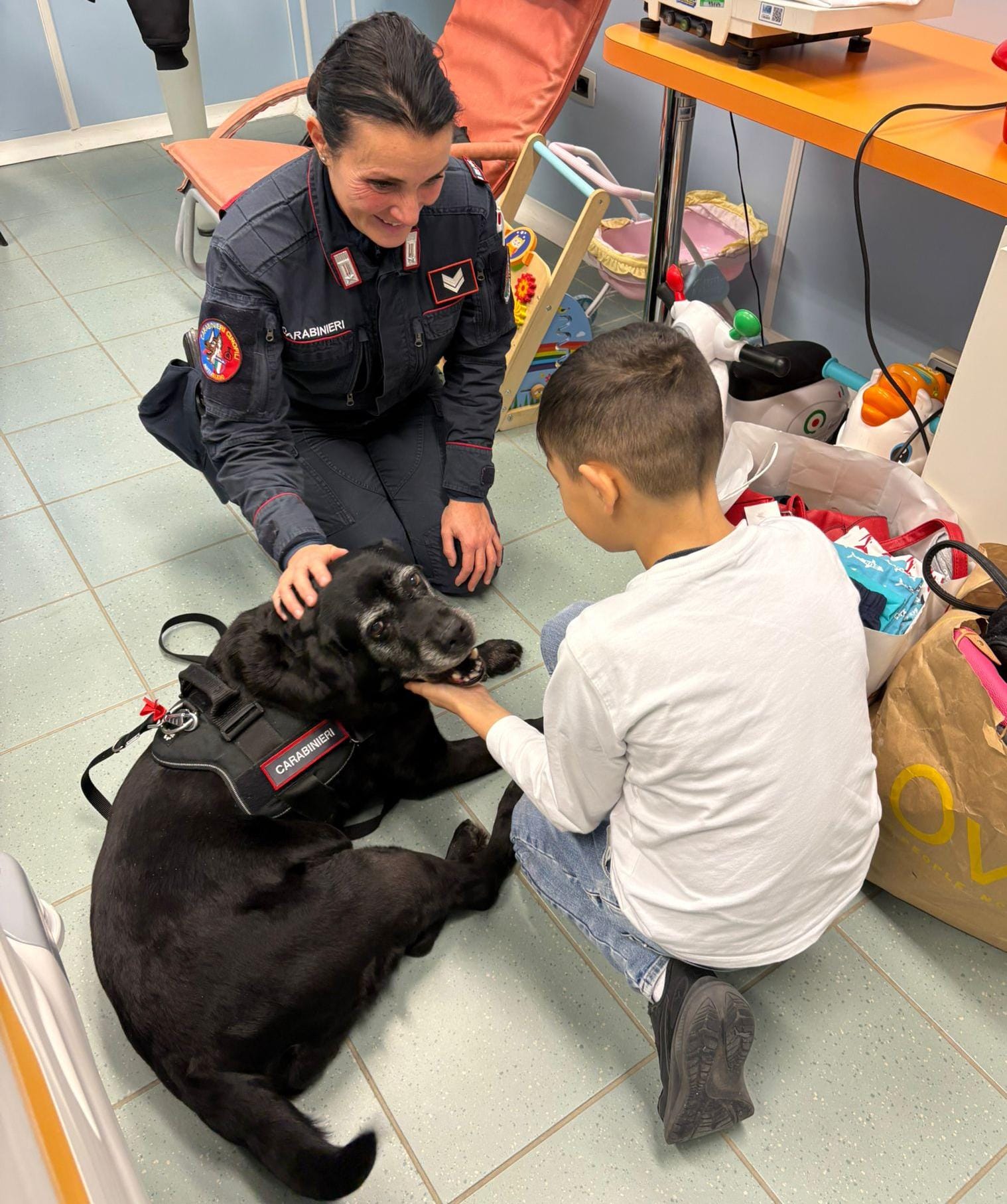 Carabiniere con Mora insieme a un bambino della pediatria