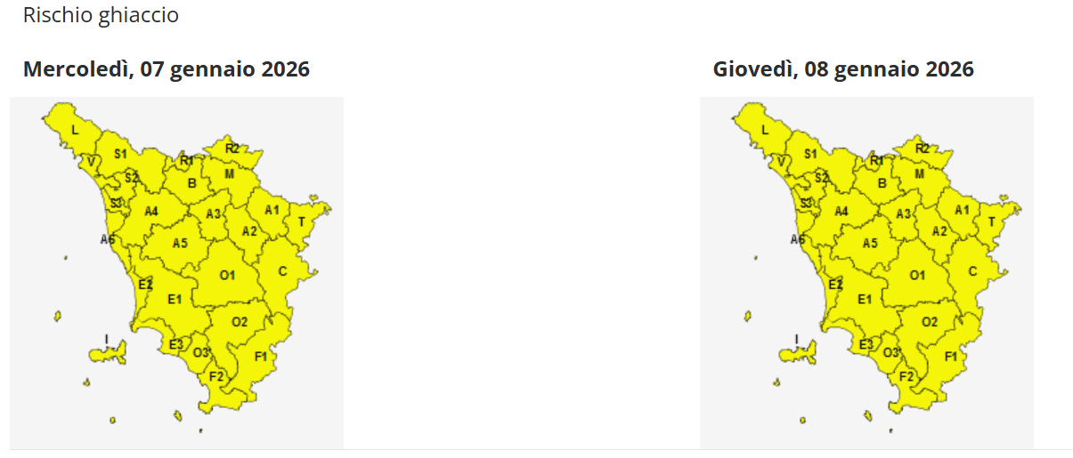Le temperature minime continuano a scendere e il freddo si fa più intenso su tutta la Toscana. A causa delle gelate diffuse a tutte le quote, la Sala operativa della Protezione civile regionale ha deciso di estendere l’allerta gialla per il rischio ghiaccio fino alle ore 12 di giovedì 8 gennaio.