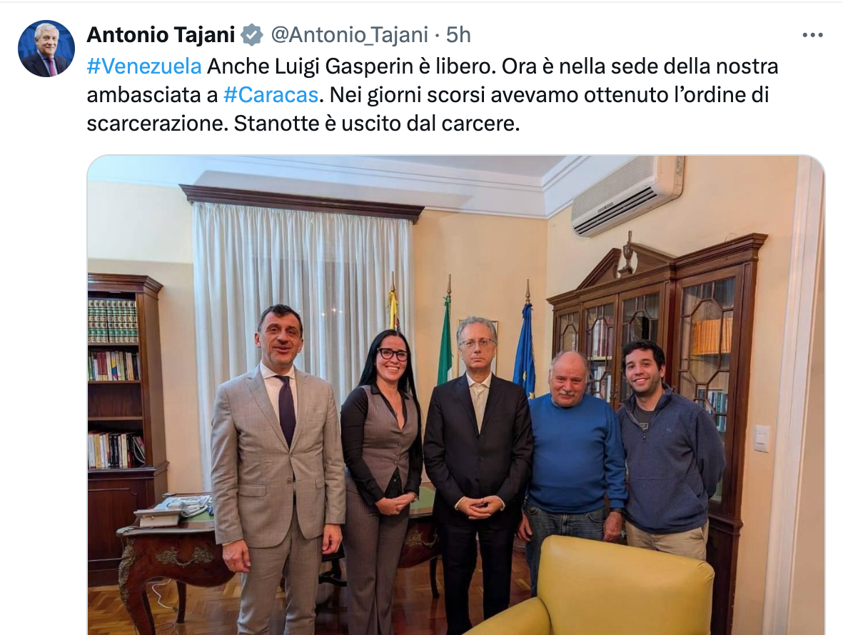 Nella notte tra mercoledì 14 e giovedì 15 gennaio il ministro degli Esteri Antonio Tajani ha annunciato tramite un post su X il rilascio di Luigi Gasperin.