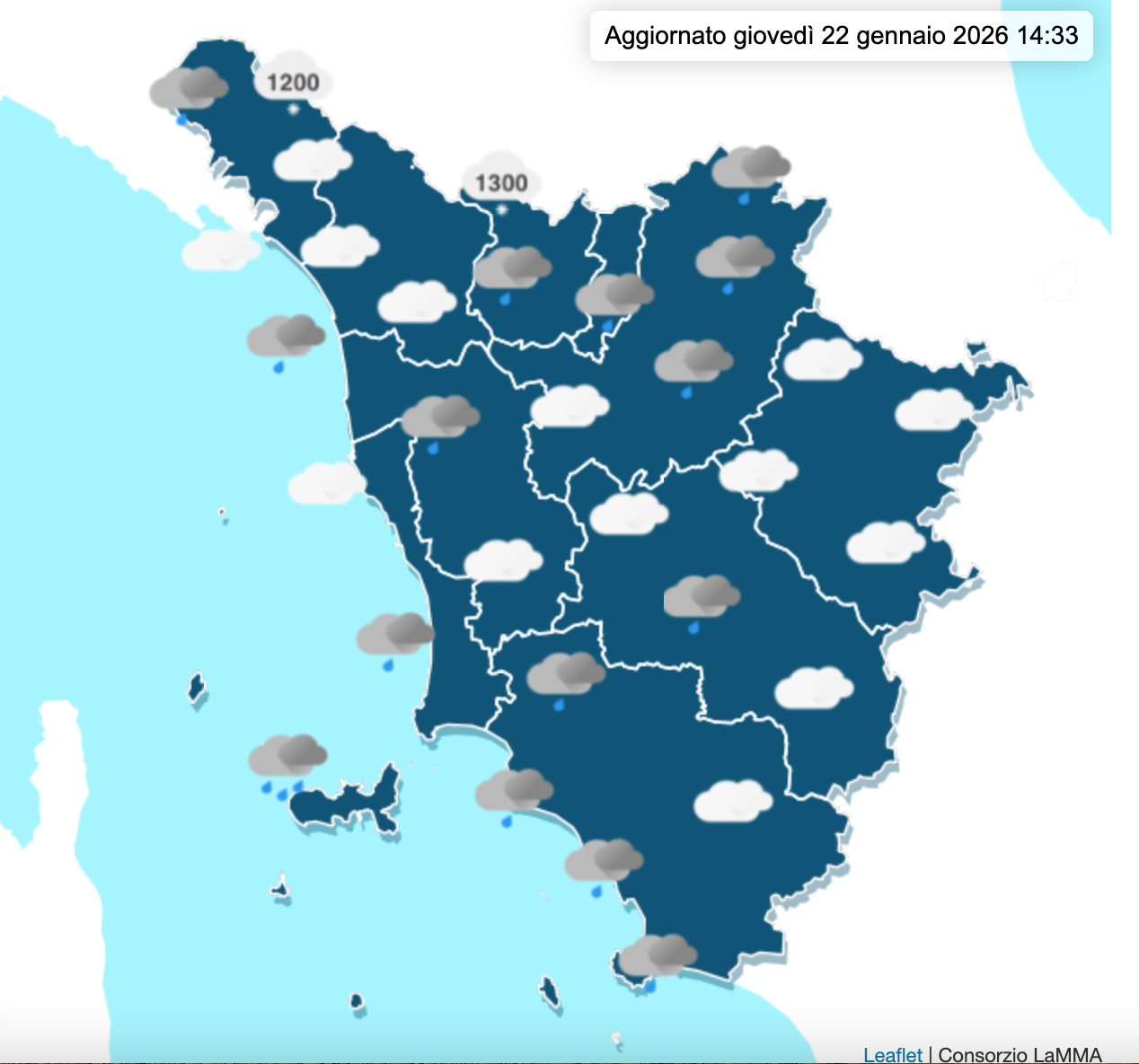 Per la giornata di domani, 23 gennaio, in tutta la provincia di Grosseto è previsto cielo coperto, con venti deboli o moderati, precipitazioni senza particolare intensità e temperature tipicamente invernali.