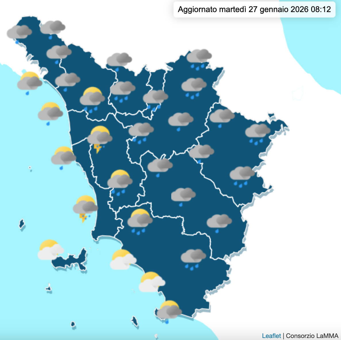 L'intensa perturbazione interesserà la Toscana a partire dalla serata di oggi, martedì 27 gennaio, con precipitazioni sparse, anche a carattere di rovescio, che dalle zone occidentali si estenderanno a tutta la regione nel corso della notte.