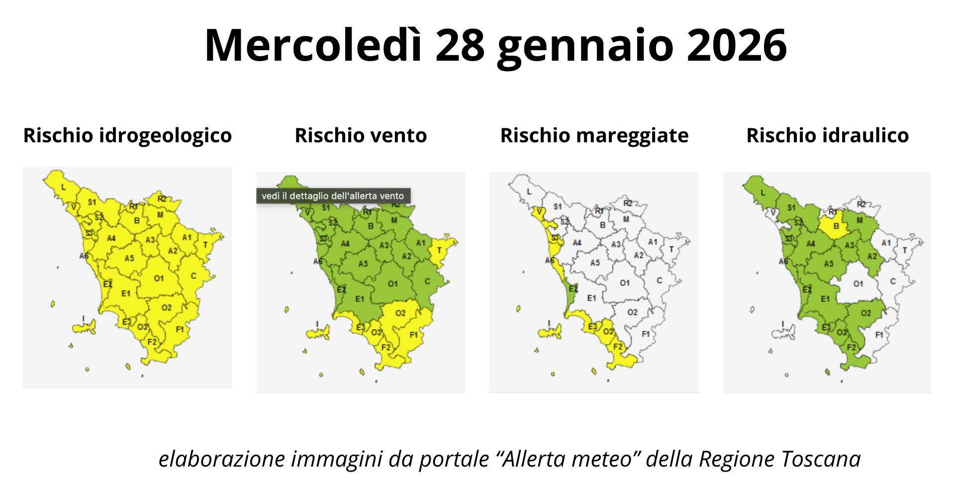 La Sala operativa della Protezione civile regionale ha emesso un'allerta meteo con codice giallo per rischio idrogeologico e idraulico del reticolo minore. Dalle 22 di stasera, 27 gennaio, è estesa a tutta la giornata di domani, mercoledì 28 gennaio, riguarderà l’intera Toscana. Per rischio idraulico del reticolo principale, codice giallo per il bacino di Bisanzio e Ombrone pistoiese, con durata per tutta la giornata di domani.