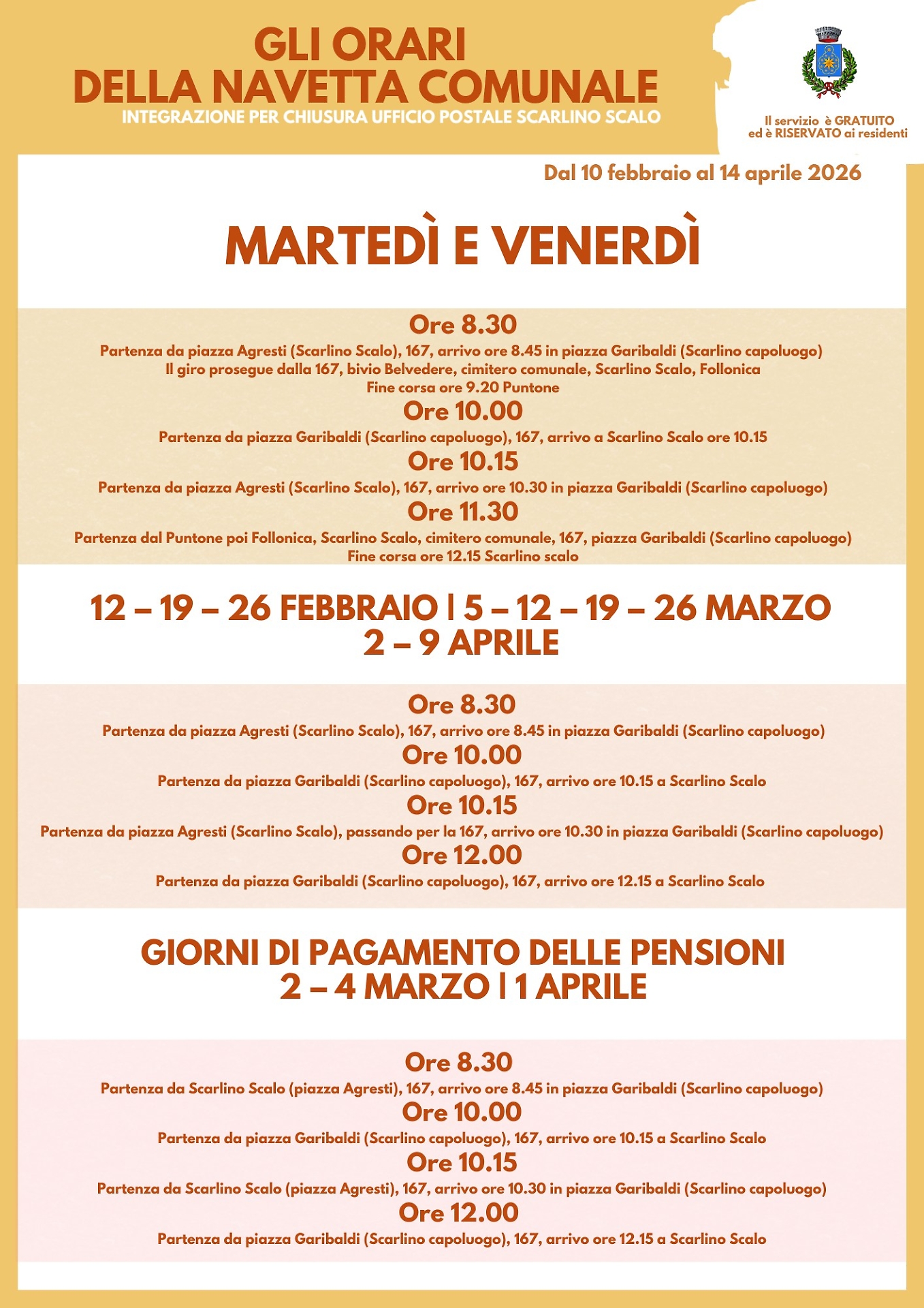 Particolare attenzione è riservata anche alle giornate di pagamento delle pensioni, quando l’afflusso agli sportelli postali è più intenso: il servizio sarà potenziato il 2 marzo, 4 marzo e 1 aprile 2026. In queste occasioni la navetta partirà da Scarlino Scalo alle 8.30 con arrivo alle 8.45 a Scarlino capoluogo, tornerà alle 10.00 con arrivo alle 10.15 a Scarlino Scalo, effettuerà una nuova partenza alle 10.15 con arrivo alle 10.30 a Scarlino capoluogo e una corsa finale alle 12.00 con arrivo alle 12.15 a Scarlino Scalo.