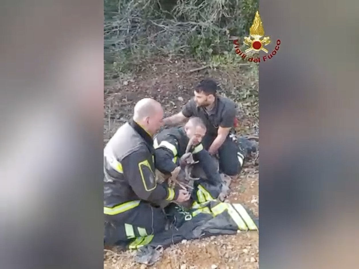 I vigili del fuoco durante le operazioni di salvataggio del daino