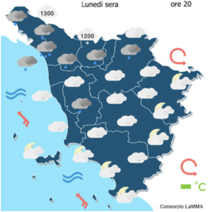 Il meteo previsto per lunedì sera intorno alle ore 20 (fonte: Consorzio Lamma)