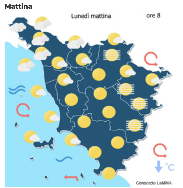 Il meteo previsto per lunedì mattina intorno alle ore 8 (fonte: Consorzio Lamma)