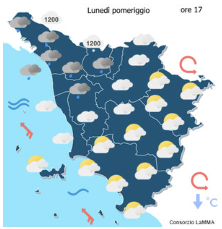 Il meteo previsto per lunedì pomeriggio intorno alle ore 17 (fonte: Consorzio Lamma)