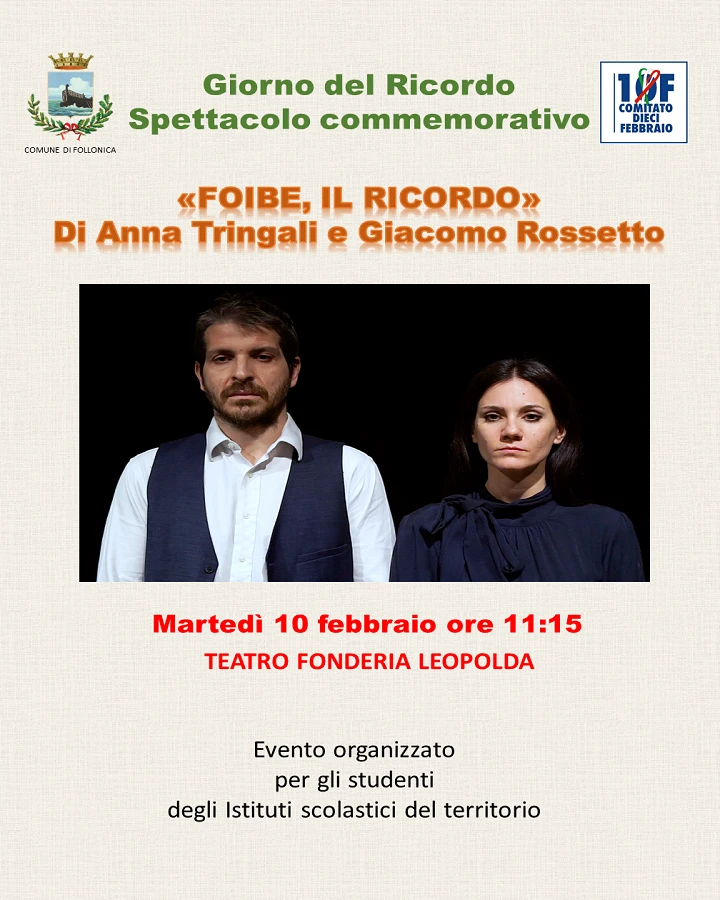 A Follonica il Giorno del Ricordo si è concentrato sul teatro Fonderia Leopolda, dove martedì 10 febbraio, alle 11:15, andrà in scena la rappresentazione “Foibe, il ricordo” di Anna Tringali e Giacomo Rossetto, organizzata in collaborazione con il Comune di Follonica. L’iniziativa è riservata agli studenti degli istituti scolastici di Follonica, che così assisteranno a uno spettacolo che ricostruisce la tragedia delle foibe e il dramma dell’esodo di circa 250.000 italiani dall’Istria e dalla Dalmazia.