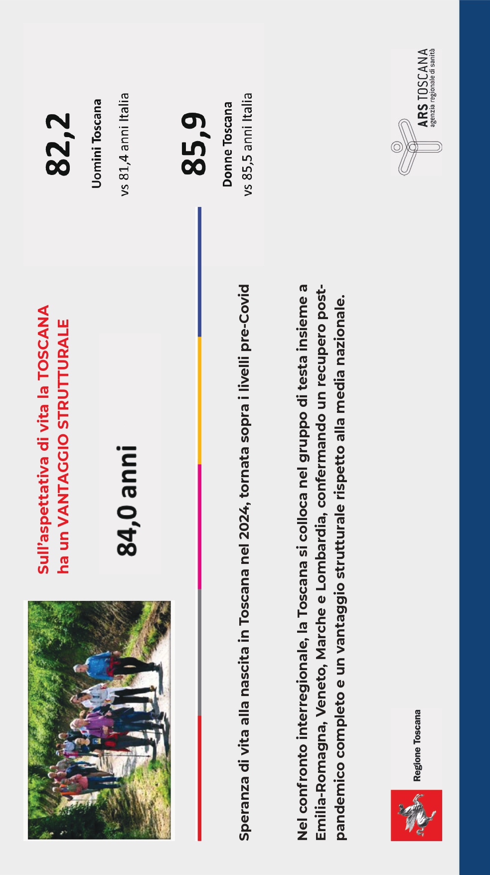 Altro che “malasanità”: stando agli ultimi dati di Ars, la Toscana, e quindi di riflesso anche la Provincia di Grosseto, sembra più un circuito benessere che una regione qualsiasi. L’aspettativa di vita alla nascita è arrivata a 84 anni, con 82,2 anni per gli uomini e 86,1 per le donne, sopra la media nazionale in entrambi i casi e dietro solo a Veneto, Emilia‑Romagna e Trentino Alto Adige, per pochi decimali.