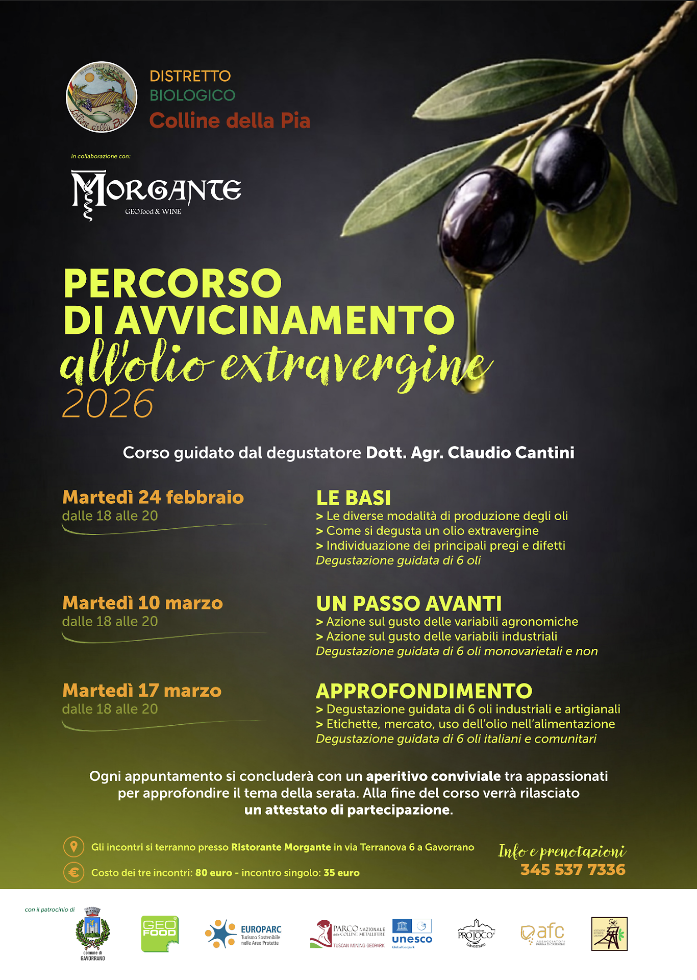 Trasformare un assaggio di olio extravergine in un viaggio tra paesaggi, cultivar e scelte agronomiche: è l’obiettivo del “Percorso di avvicinamento all’olio extravergine 2026”, il nuovo corso lanciato dal Distretto Biologico Colline della Pia al Ristorante Morgante di Gavorrano.