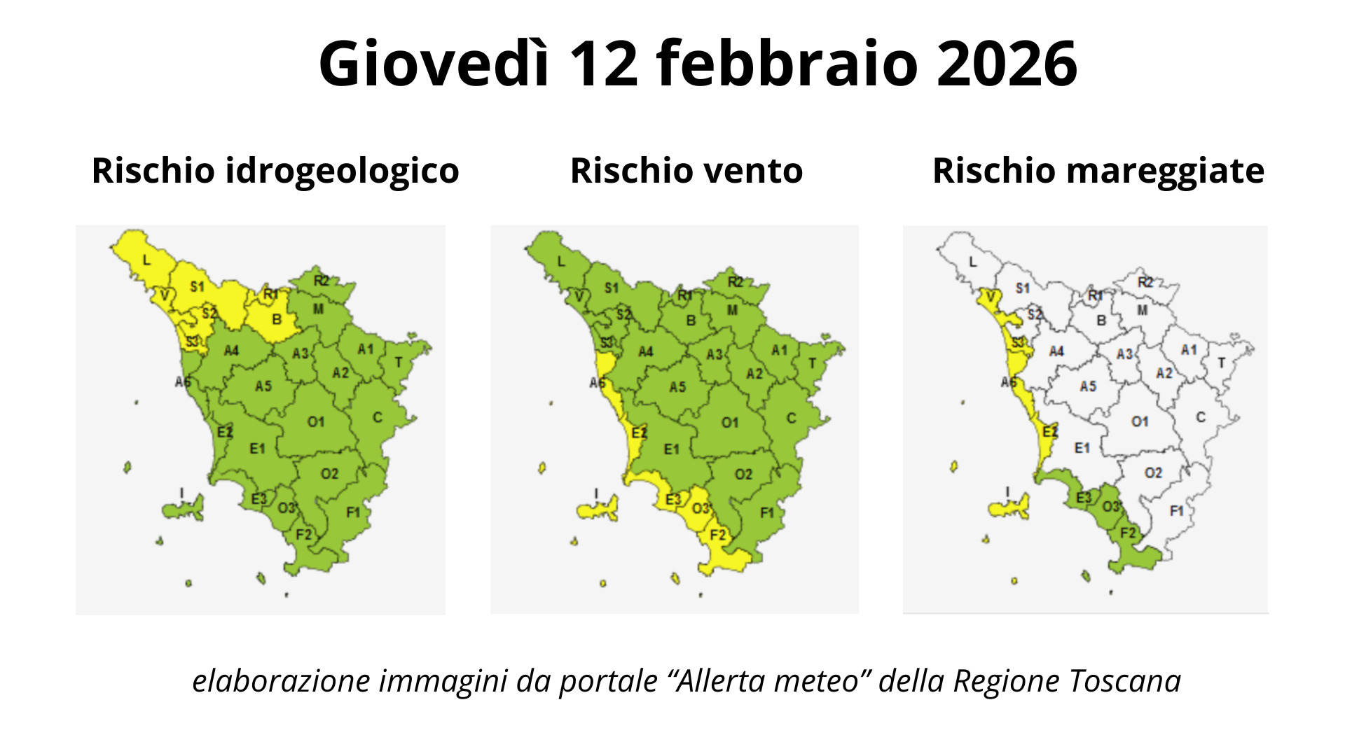 Per domani, giovedì 12 febbraio, è stata emessa un’allerta meteo di codice giallo in Toscana per rischio idraulico e idrogeologico sul reticolo minore, vento forte e mareggiate. L’avviso, che interessa anche la provincia di Grosseto, è stato diffuso dalla Sala operativa unificata della Protezione civile regionale.