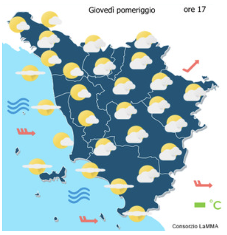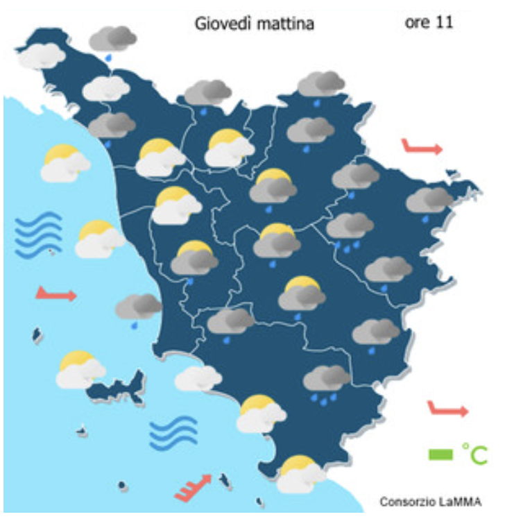 Zone come quelle di Grosseto (temp. min 6°C, max 15°C), Livorno (7-16°C), Massa Carrara (6-15°C), Pisa (7-16°C) e Siena (6-15°C) prevedono condizioni variabili al mattino con piogge sparse, molto nuvoloso al pomeriggio e venti moderati-forti da ovest.