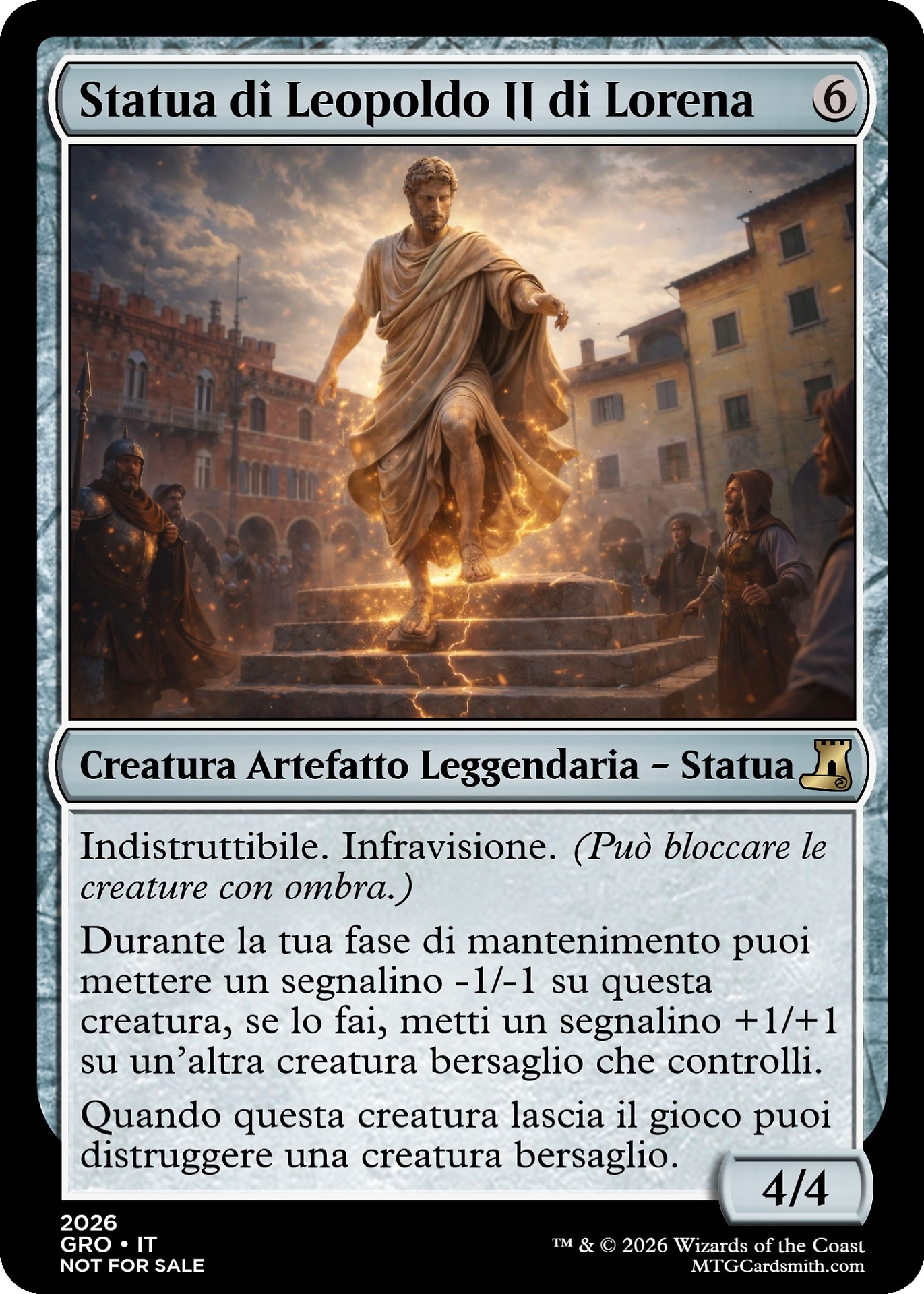 La carta in questione (si vede anche nell’immagine condivisa) è il personaggio “Marras, l’Ambasciatore”, inserita in un set “maremmano” che sta facendo parlare di sé proprio in questi giorni. E non si tratta di un’idea estemporanea: I vicoli di Grossetum è un lavoro ampio, costruito con la logica e l’estetica di Magic: The Gathering, che trasforma Grosseto e la Maremma in un vero e proprio universo narrativo fatto di personaggi, luoghi e simboli riconoscibili.