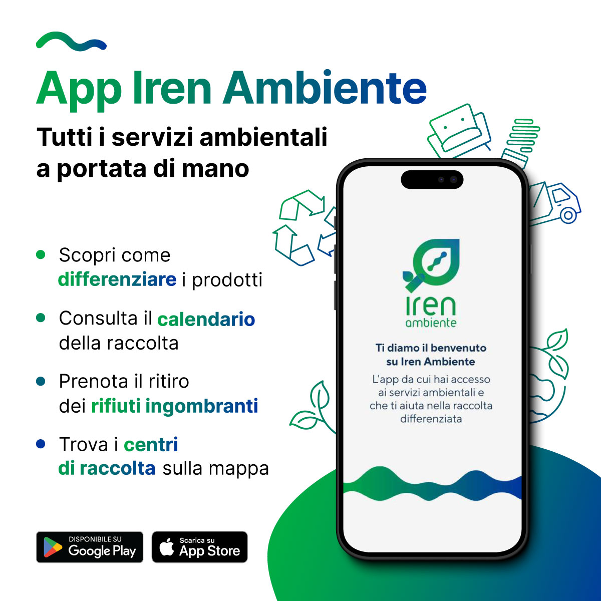 L’app Iren Ambiente è scaricabile inquadrando il QR code presente sui materiali informativi o visitando il link: seitoscana.it/app-iren-ambiente.