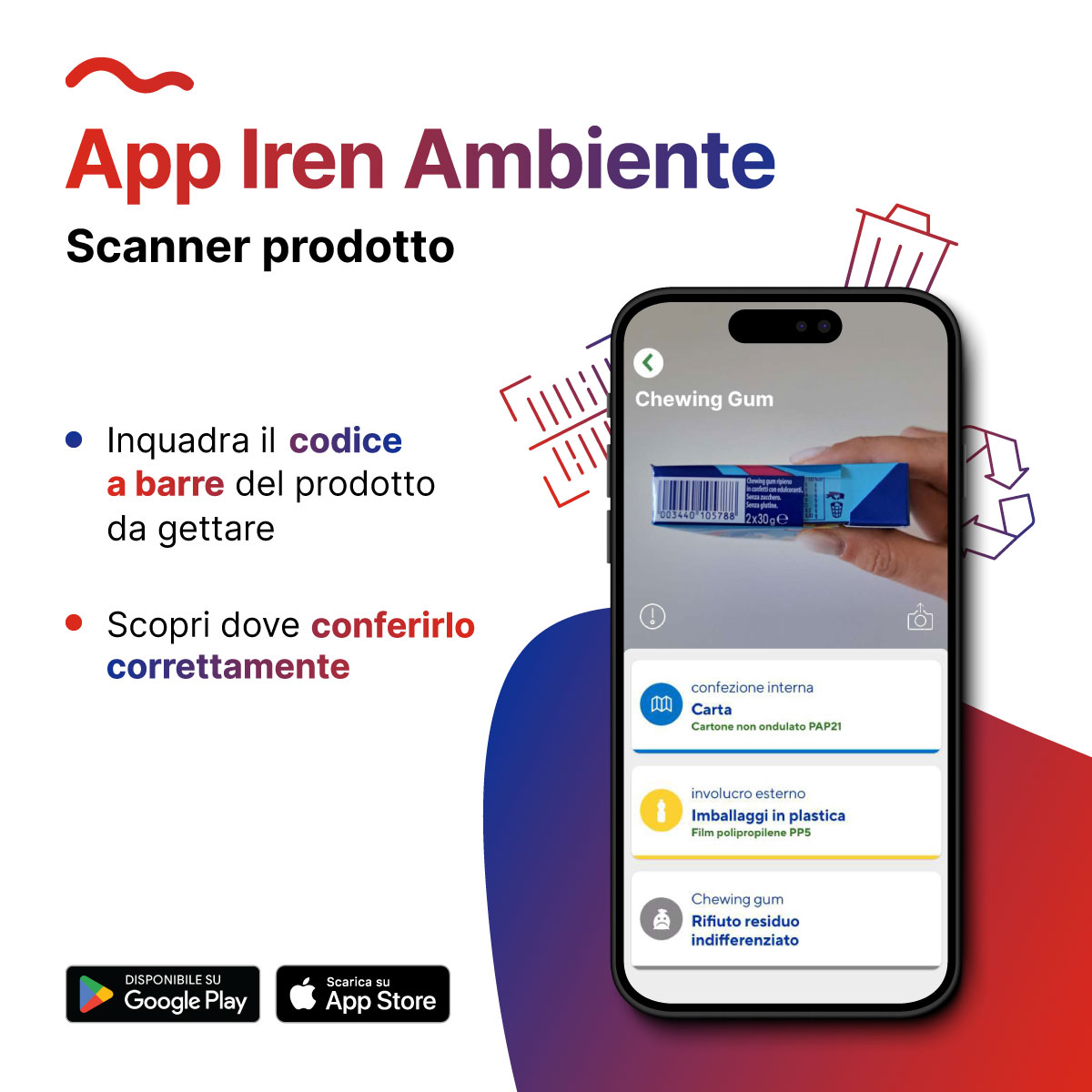• Scansiona & Differenzia: inquadrando il codice a barre di un prodotto, l'app indica immediatamente in quale contenitore va gettato.