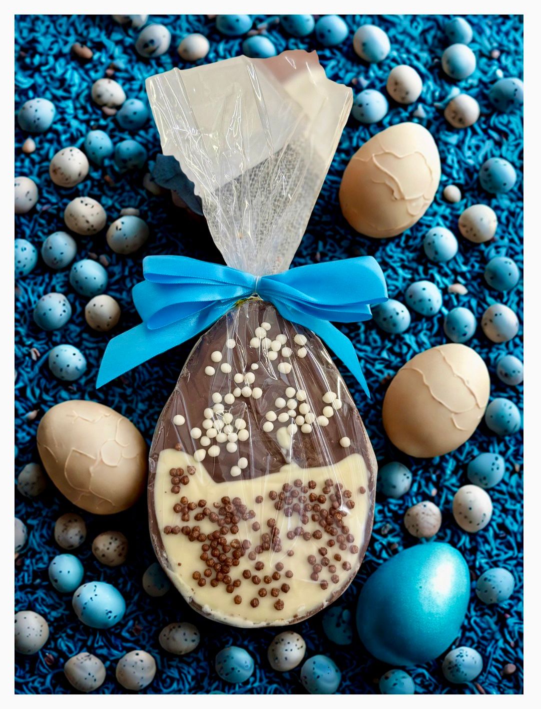 Mezzo uovo ripieno di crema di cioccolato al latte e bianco