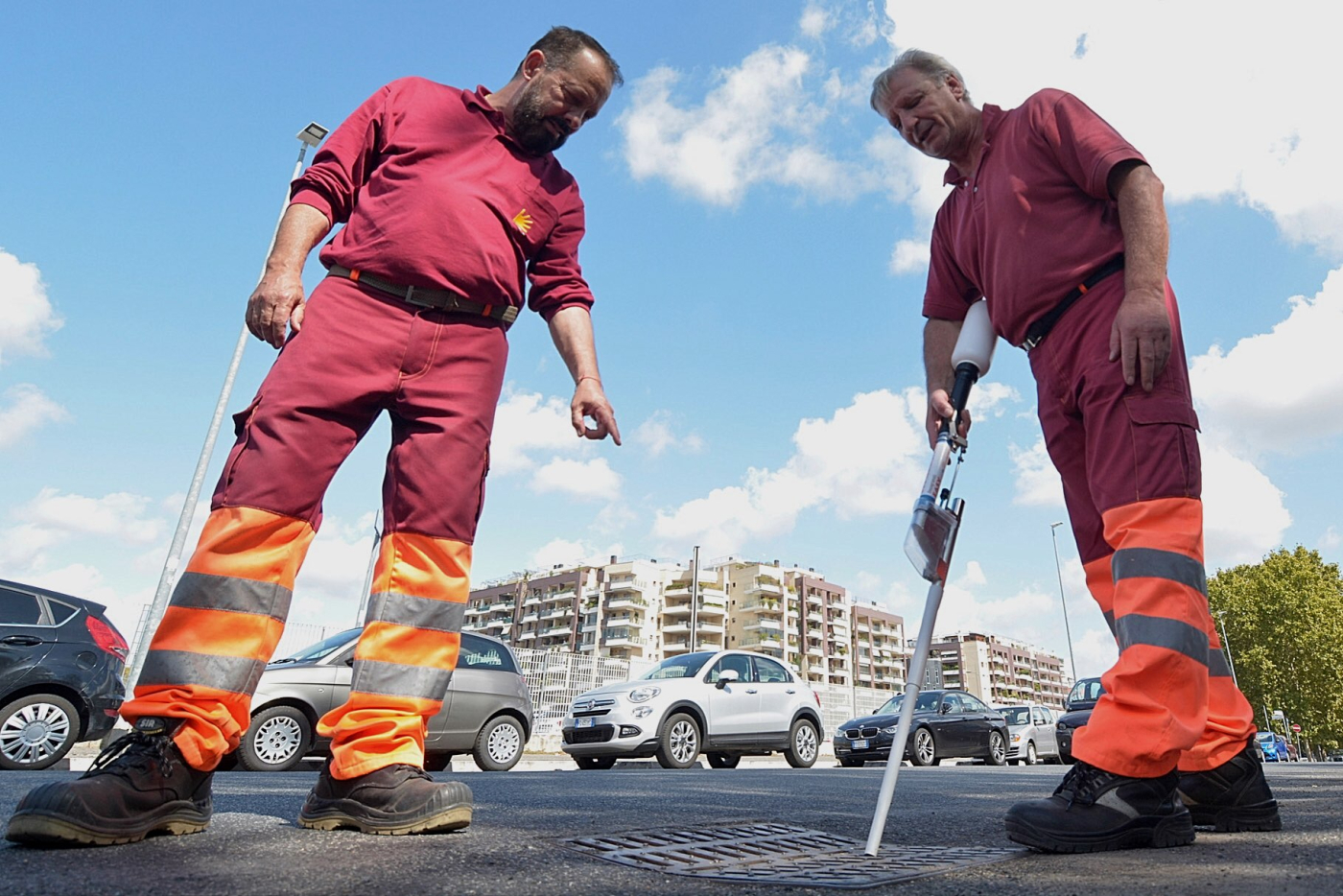 Disinfestazione dei tombini da parte dei tecnici (Foto La Presse)