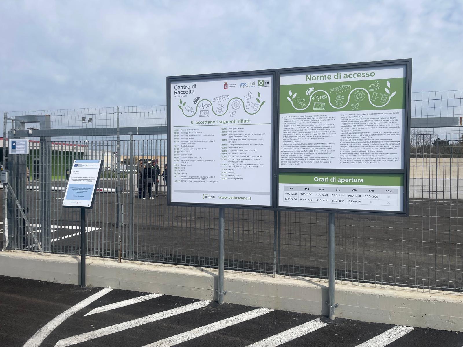 Taglio del nastro per il nuovo centro di raccolta dei rifiuti di via Giordania, una struttura d’avanguardia che entrerà ufficialmente in funzione già dal pomeriggio di oggi. L'opera, che ha salutato la città ieri 30 marzo, è realizzata su un'area di circa 3.000 metri quadrati, e rappresenta un tassello fondamentale per il potenziamento della raccolta differenziata e della sostenibilità ambientale nel capoluogo maremmano.