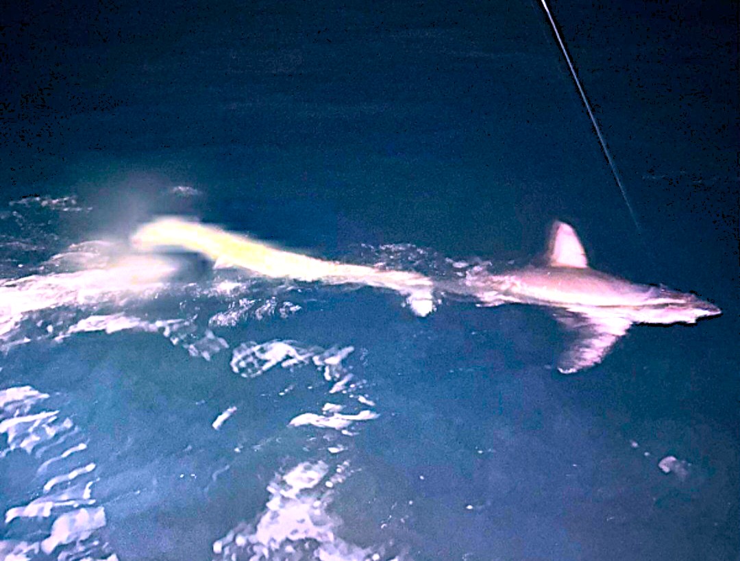 Uno squalo volpe lungo circa tre metri. Ha abboccato durante una battuta di pesca serale di Fabio Andreuccetti, ex segretario del Circolo Nautico e della Vela Argentario e sostenitore di Artemare Club.