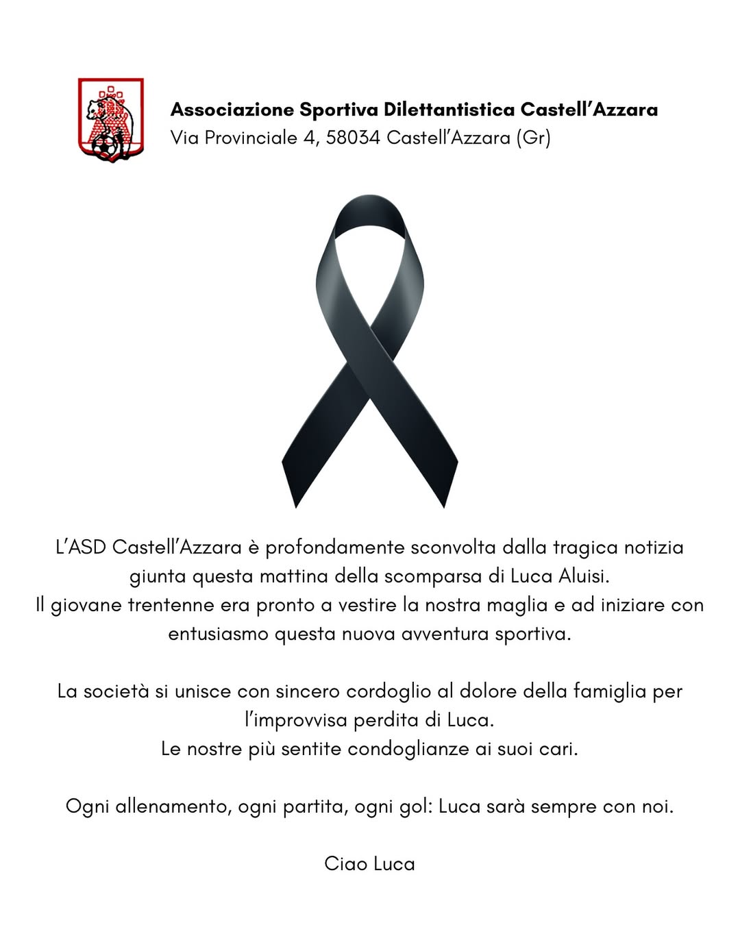 E ora la società lo ricorda così: "L'Asd Castell'Azzara è profondamente sconvolta dalla tragica notizia giunta questa mattina della scomparsa di Luca Aluisi. Il giovane trentenne era pronto a vestire la nostra maglia e ad iniziare con entusiasmo questa nuova avventura sportiva. La società si unisce con sincero cordoglio al dolore della famiglia per l'improvvisa perdita di Luca. Le nostre più sentite condoglianze ai suoi cari. Ogni allenamento, ogni partita, ogni gol: Luca sarà sempre con noi. Ciao Luca".