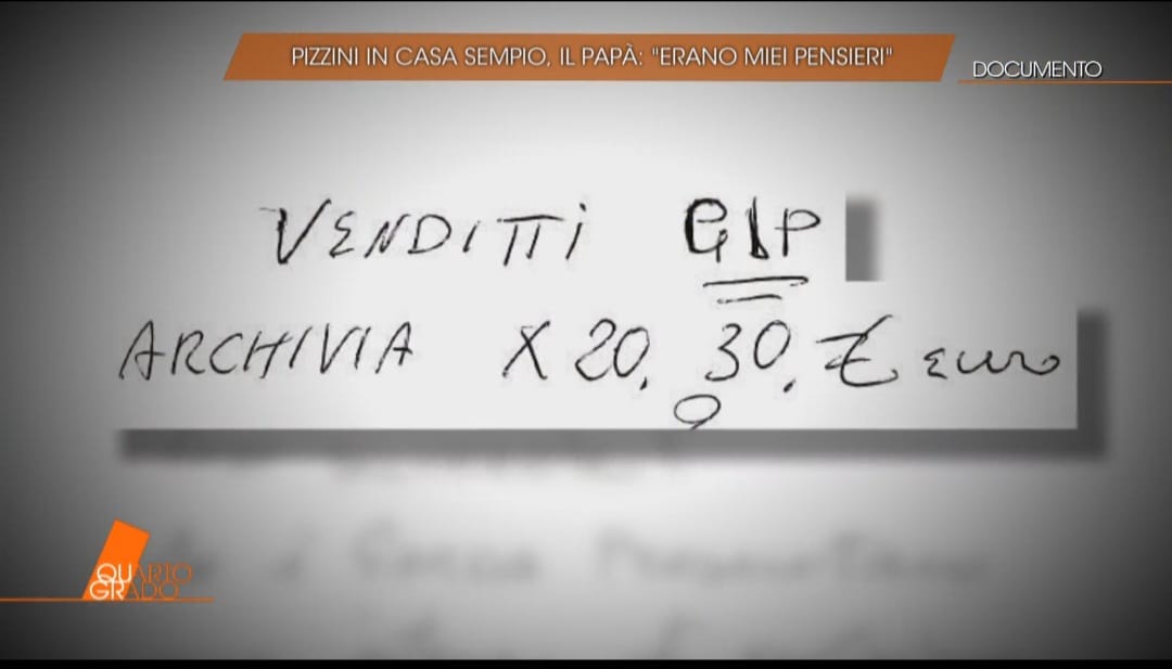 Nel corso del servizio trasmesso ad ogni immagine mostrata Giuseppe Sempio ha dato una motivazione: sulla prima nota riportava ‘Venditti Gip archivia X 20-30 euro’ (foto 1) che per la Procura di Brescia sarebbero 20-30 mila euro: «La storia dei 20-30 euro bisogna sfatarla un po'. Stanno mischiando tutte le cose. Se ci fosse stato scritto 20, 30, 40 o 200 mila euro… ma c'era scritto un'altra cifra. Riguardava qualcosa con gli avvocati, adesso non so se fosse quello che dicono loro, le marche da bollo o altre cose».