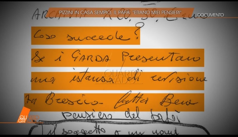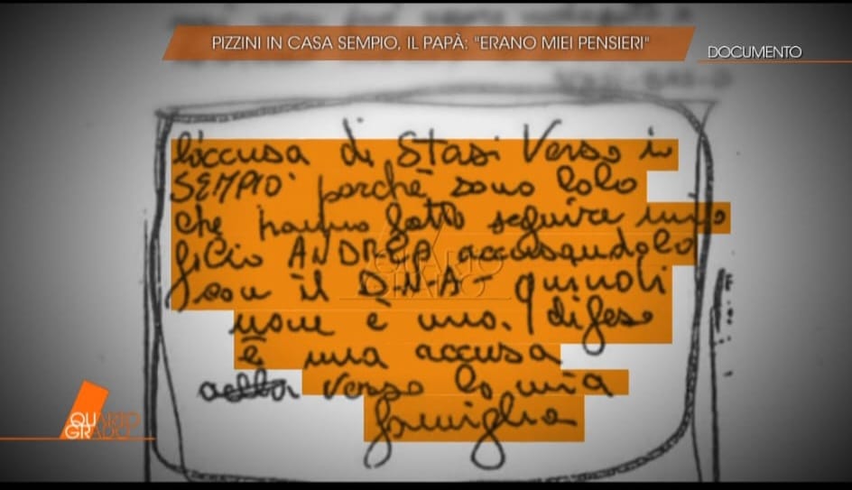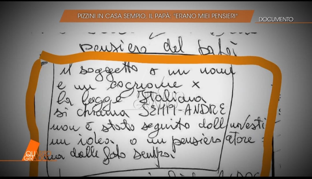 In un altro appunto si legge: ‘Pensiero del papà, il soggetto ha un nome e un cognome per la legge italiana. Si chiama Sempi-Andrè’ (foto 3) Questa la spiegazione di Giuseppe Sempio: «Secondo me, quella roba lì l'ho tirata fuori da qualche giornale. Io, in casa, mi appuntavo qualche frase ma senza darci peso, insomma».