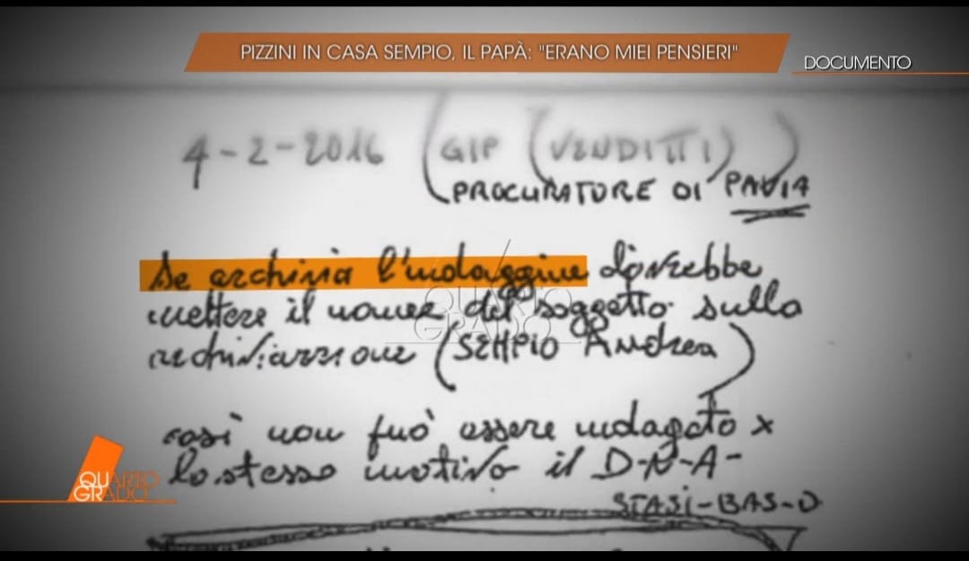 Nel nuovo bigliettino con scritto ‘4 febbraio 2016. GIP Venditti, procuratore di Pavia. Se archivia l'indagine, dovrebbe mettere il nome del soggetto sull'archiviazione, (Sempio Andrea). Così non può essere indagato per lo stesso motivo il DNA’ (foto 4). Giuseppe Sempio su queste frasi dichiara: «Io GIP, GUP, o quelle robe lì, ancora adesso non riesco a capire che mansione ha».