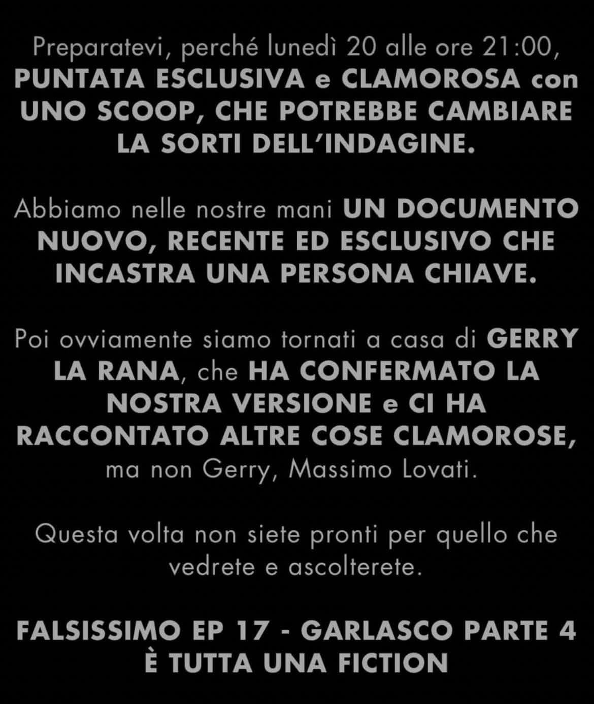 “Preparatevi perché lunedì 20 alle ore 21:00 andrà in onda una puntata esclusiva e clamorosa, con uno scoop che potrebbe cambiare la sorte dell’indagine sul caso Garlasco”. “Abbiamo nelle nostre mani un documento nuovo, recente ed esclusivo che incastra una persona chiave”. E ancora: "Poi ovviamente siamo tornati a casa di Gerry la Rana, che ha confermato la nostra versione e ci ha raccontato altre cose clamorose, ma non Gerry, Massimo Lovati". “Questa volta non siete pronti per quello che vedrete e ascolterete”, annuncia Corona.