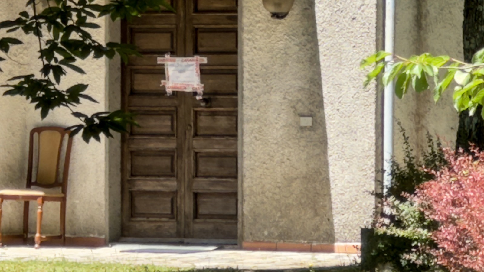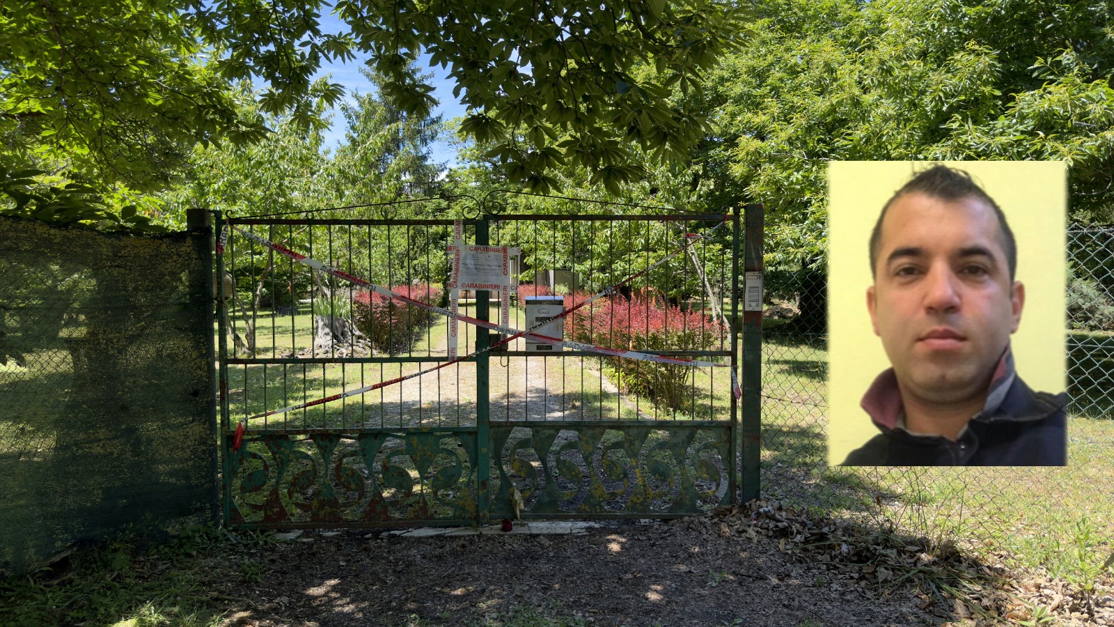 Il cancello della villetta e la foto della vittima