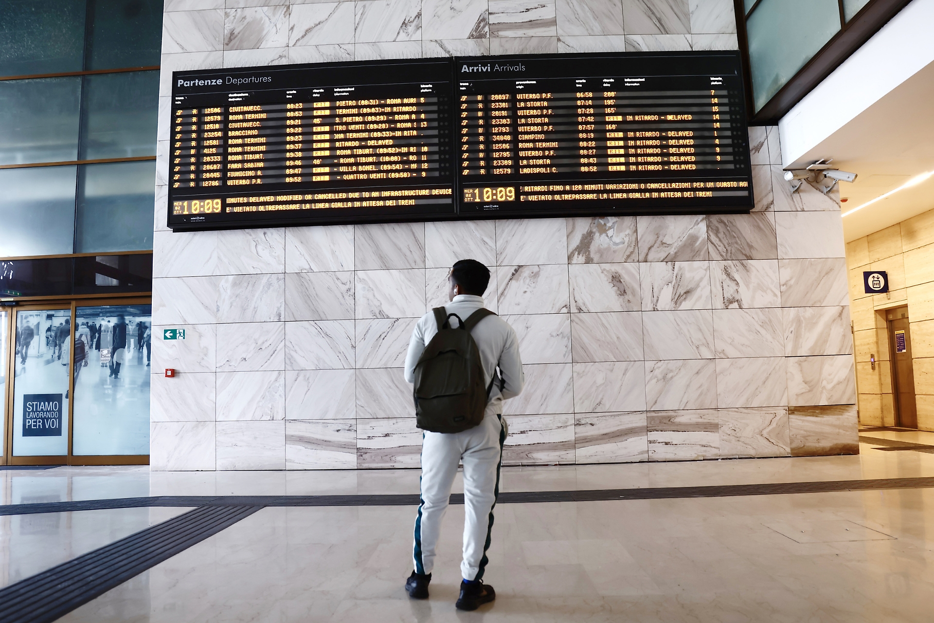 Turista in attesa di novità dal tabellone (foto LaPresse)