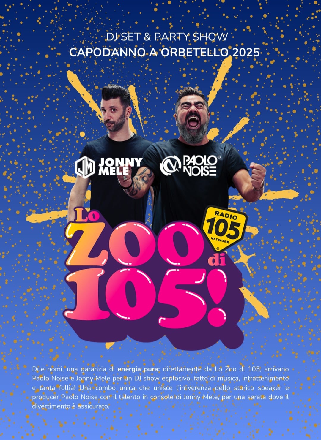 L'apertura della serata, prevista per le 22.30, è affidata a Jonny Mele, artista poliedrico e intrattenitore capace di scaldare subito il pubblico con il suo carisma e la sua energia. La sua performance darà ufficialmente il via alla notte più lunga dell’anno con un mix di musica, ritmo e interazione con il pubblico. Alle 23 sarà la volta del noto conduttore dello Zoo di 105, Paolo Noise (Radio 105), che farà ballare il pubblico con un dj set esplosivo, tra hit internazionali, remix anni ’90/2000 e la sua travolgente ironia. Allo scoccare della mezzanotte il pubblico e gli artisti accoglieranno il nuovo anno con un emozionante countdown, spettacolo di luci e un brindisi collettivo che illuminerà la laguna. La notte proseguirà, poi, con lo special guest Marco Melandri, campione del mondo di motociclismo e personaggio televisivo molto amato, che salirà sul palco per festeggiare insieme ai cittadini di Orbetello, condividendo la sua simpatia e la sua inconfondibile energia. Il suo dj set sta conquistando tutto il Paese. A condurre la notte di San Silvestro sarà Selvaggia Roma, volto noto della televisione e dei social, che sarà la padrona di casa dell’evento, accompagnando gli artisti con la sua verve e la sua simpatia insieme a un corpo di ballo con ballerine professioniste che animeranno la piazza con coreografie spettacolari. Al pubblico saranno inoltre offerte le magliette ufficiali "Radio 105" e "Zoo di 105".